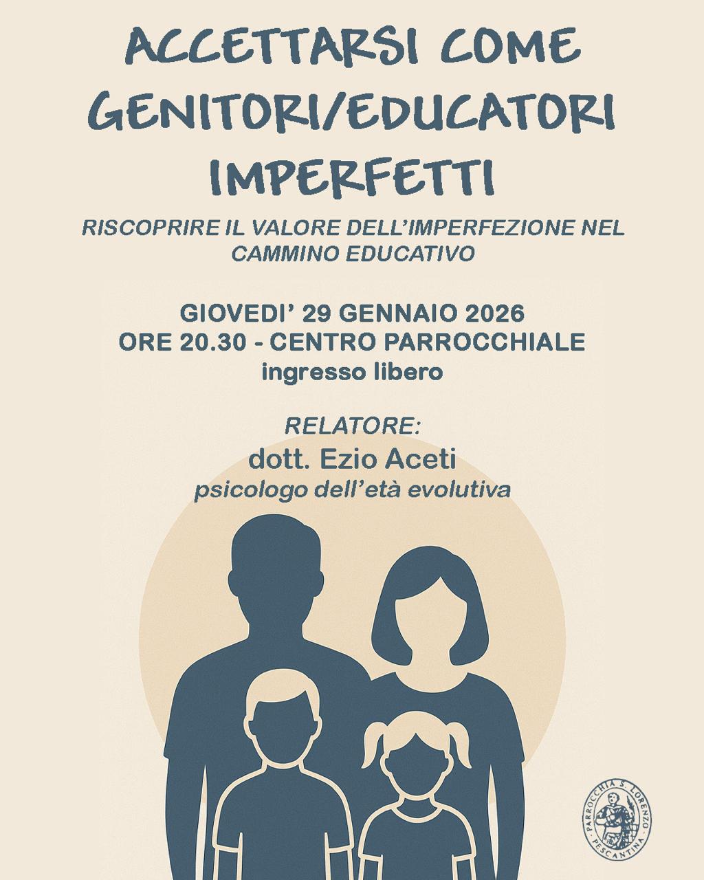 In un tempo in cui la tecnologia, le relazioni e l’educazione mettono ogni giorno di fronte a nuove sfide, la parrocchia di Pescantina organizza “Accettarsi come genitori/educatori imperfetti“, un incontro dedicato a genitori, educatori e a chiunque sia coinvolto nel delicato e prezioso compito educativo.