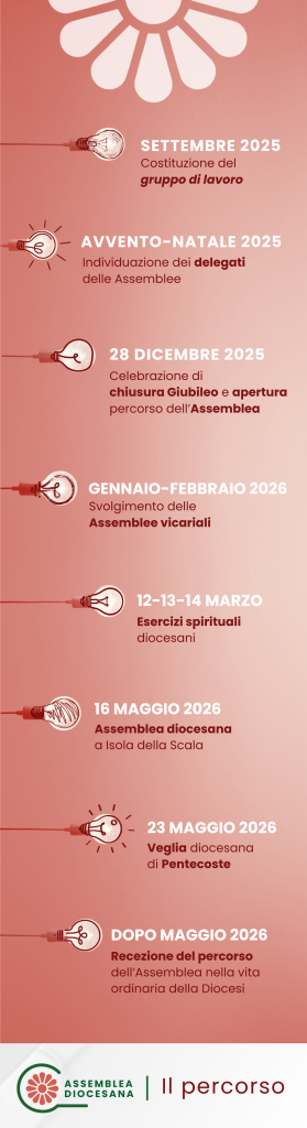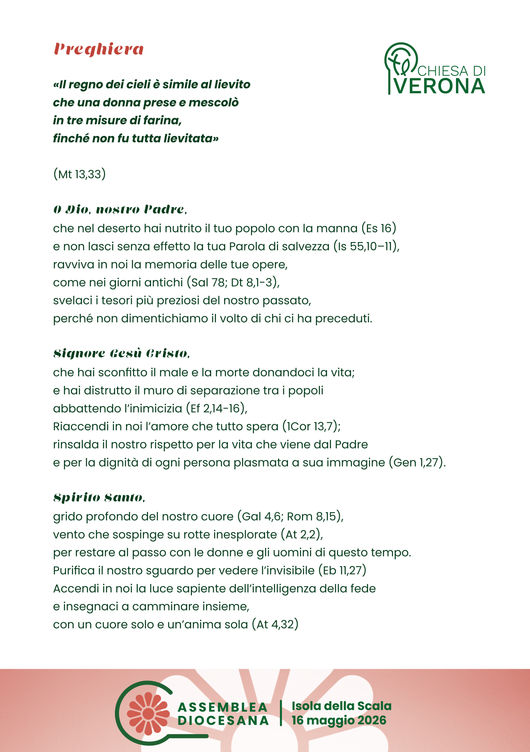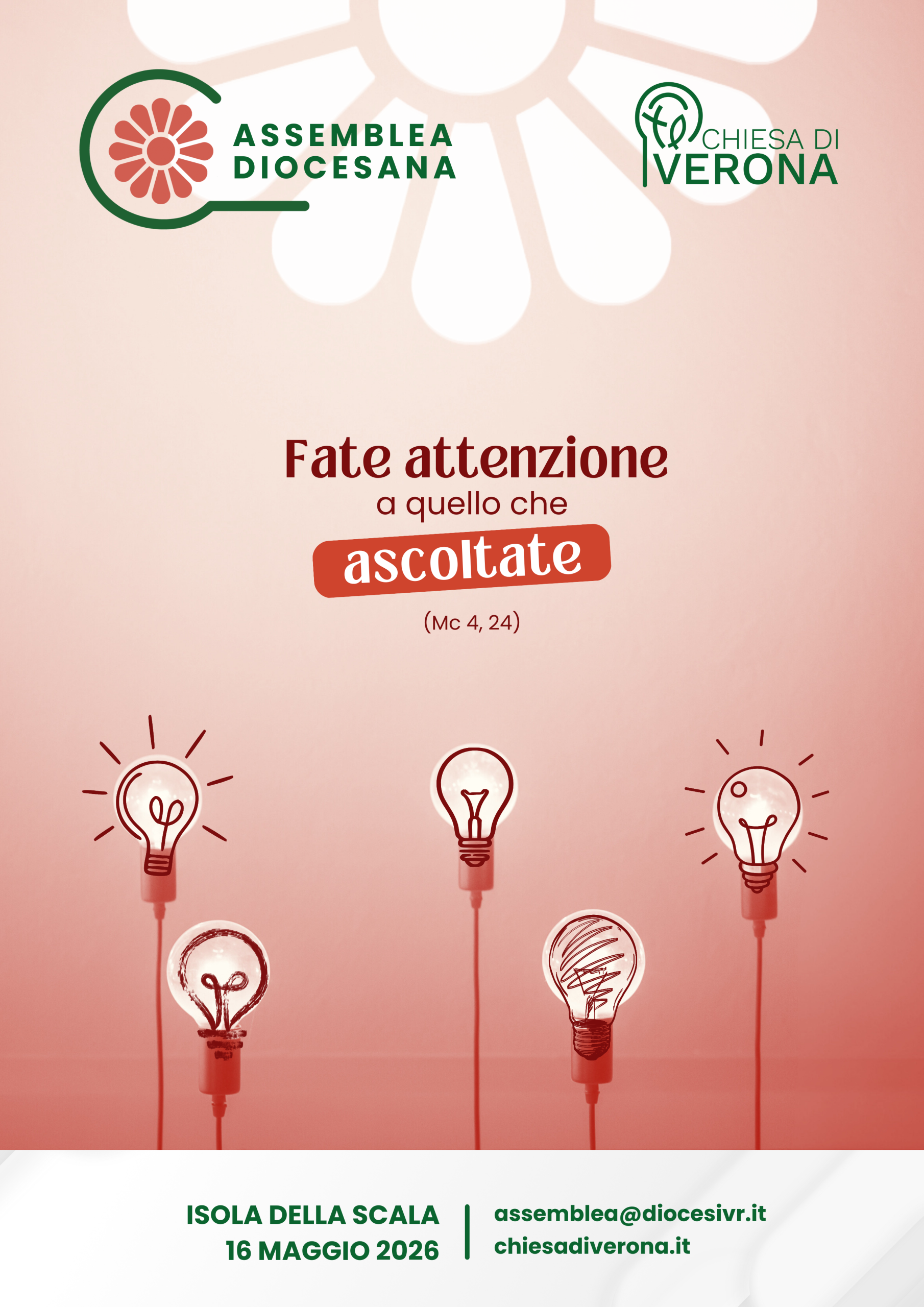 Assemblea diocesana 202616 maggio 2026 "Fate attenzione a quello che ascoltate" Marco 4, 24 ISOLA DELLA SCALA 16 maggio 2026 assemblea@diocesivr.it PERCHÈ ORIZZONTE CHI E CHE COSA COME LA PREGHIERA IL PERCORSO LE PAROLE DEL VESCOVO NEWS Note pratiche per i vicari Come si svolge l’Assemblea? Chi e che cosa fa l’Assemblea? Le schede di lavoro dell’Assemblea vicariale I delegati delle Assemblee vicariali L’orizzonte dell’Assemblea Perchè l’Assemblea? La parola del Vescovo verso l’Assemblea diocesana Il percorso dell’Assemblea diocesana La preghiera per l’Assemblea diocesana condividi su 3 Dicembre 202511 Dicembre 2025