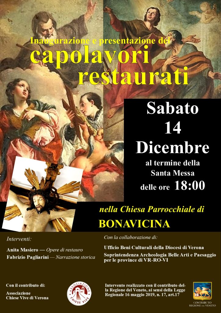 Sabato 14 dicembre, al termine della Santa Messa delle ore 18:00, si terrà l’inaugurazione e la presentazione dei capolavori restaurati nella Chiesa Parrocchiale di Bonavicina.