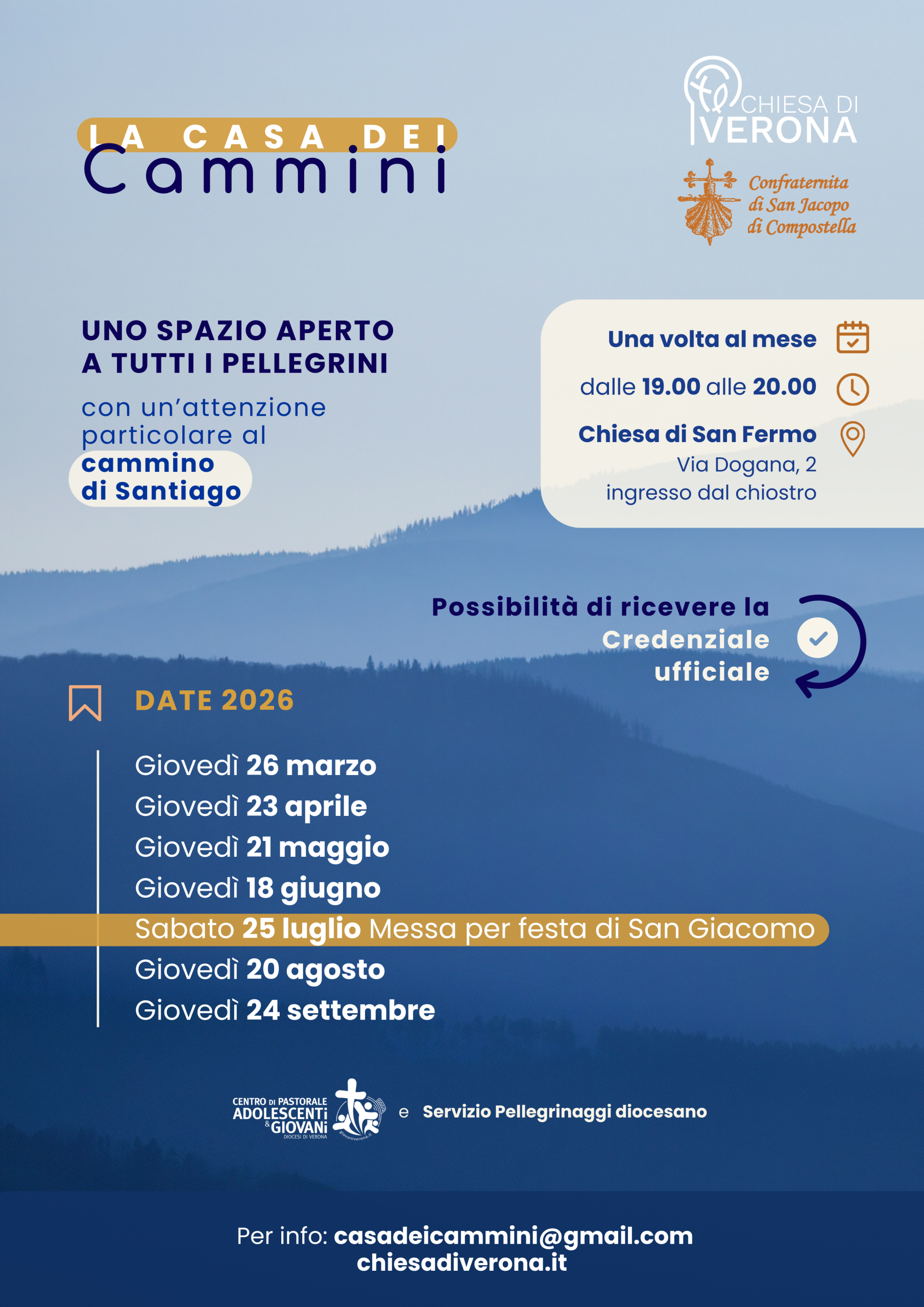 Da secoli la Chiesa di Verona vive e sostiene l’esperienza del pellegrinaggio. Migliaia di persone partono ogni anno dalla nostra città, attratte dal desiderio di mettersi in cammino e sostenute da una comunità attenta e accogliente.