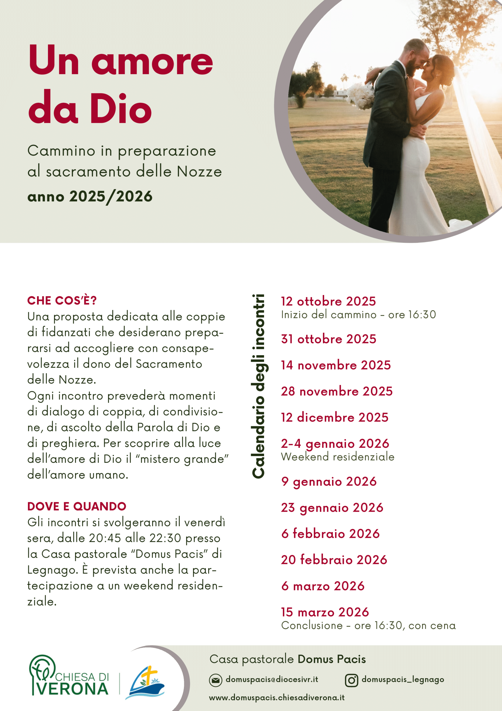 "Un amore da Dio": 11 incontri, dal 12 ottobre 2025, il venerdì sera dalle 20.45 alle 22.30, a parte primo ed ultimo incontro, la domenica pomeriggio, dalle 16.30.