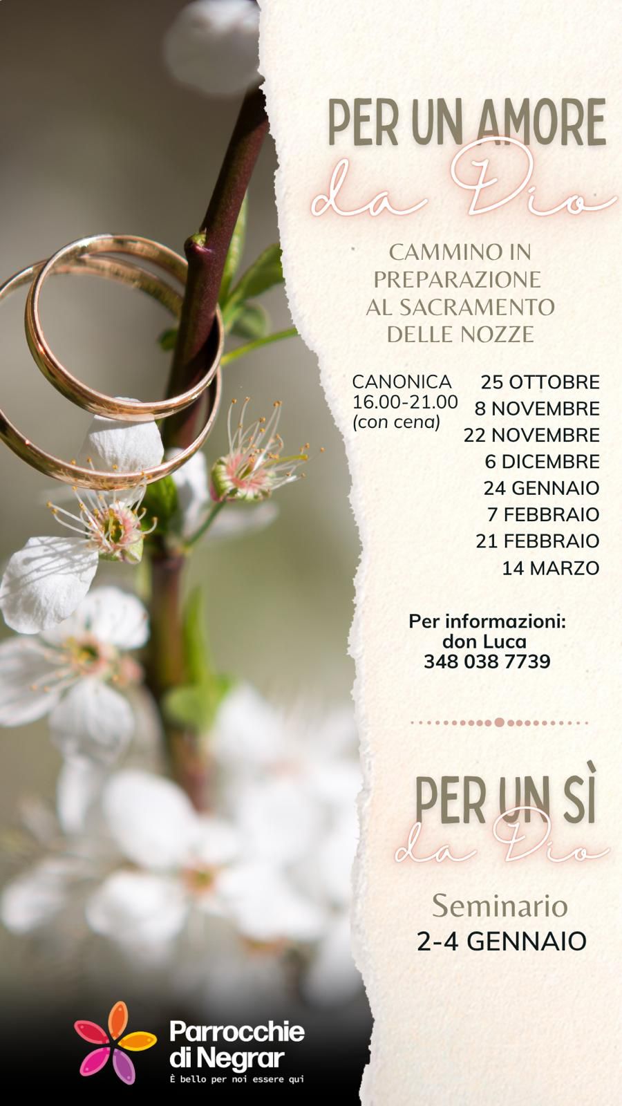 "Per un amore da Dio": 8 incontri, il sabato sera a partire dal 25 ottobre, dalle 16.00 alle 21.00 con cena.