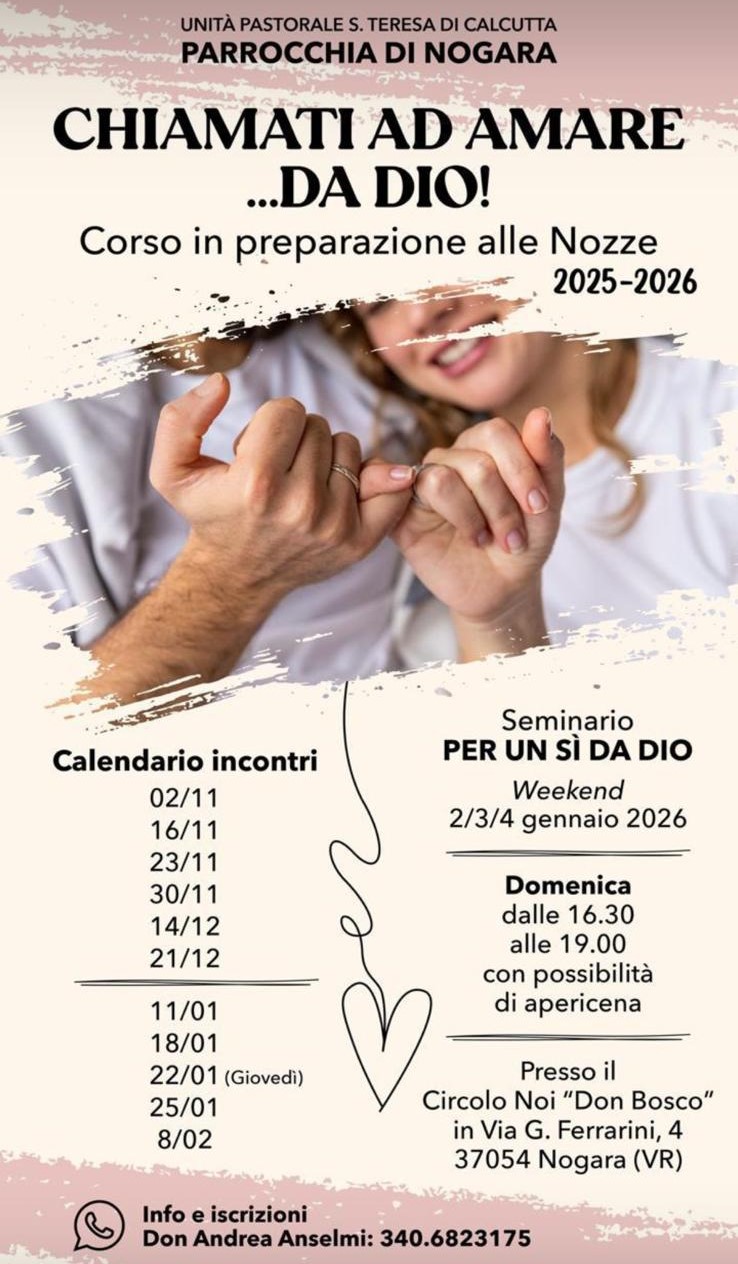 "Chiamati ad amare... da Dio!": 11 incontri, sempre la domenica dal 2 novembre 2025 all'8 febbraio 2026 (un incontro di giovedì, il 22 gennaio), dalle 16.30 alle 19.00 con possibilità di apericena.