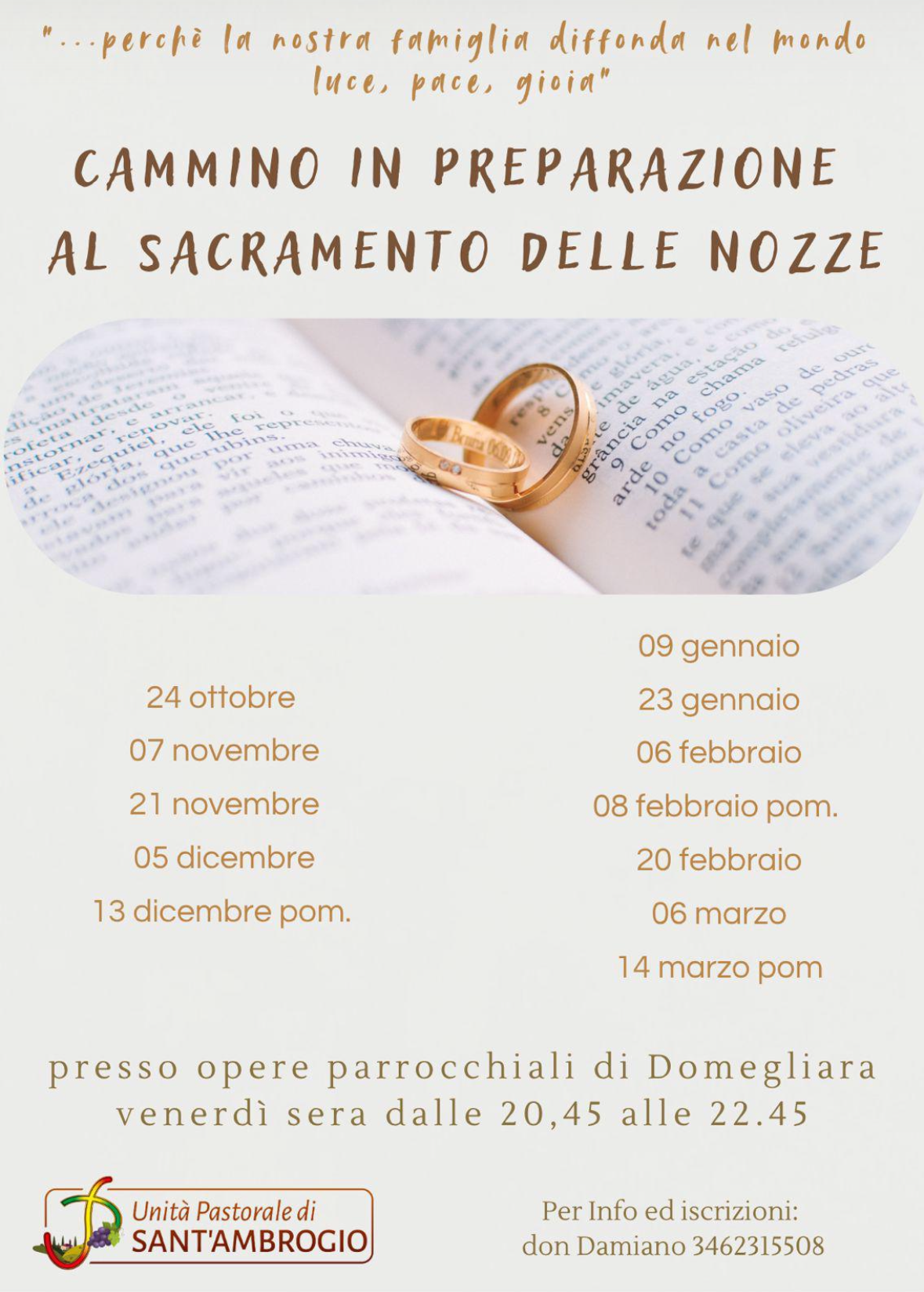 Per celebrare il sacramento del matrimonio è opportuno prendere contatto con il parroco della parrocchia di uno degli sposi o della parrocchia in cui si andrà ad abitare, il quale potrà accompagnare i fidanzati in un adeguato cammino di preparazione.