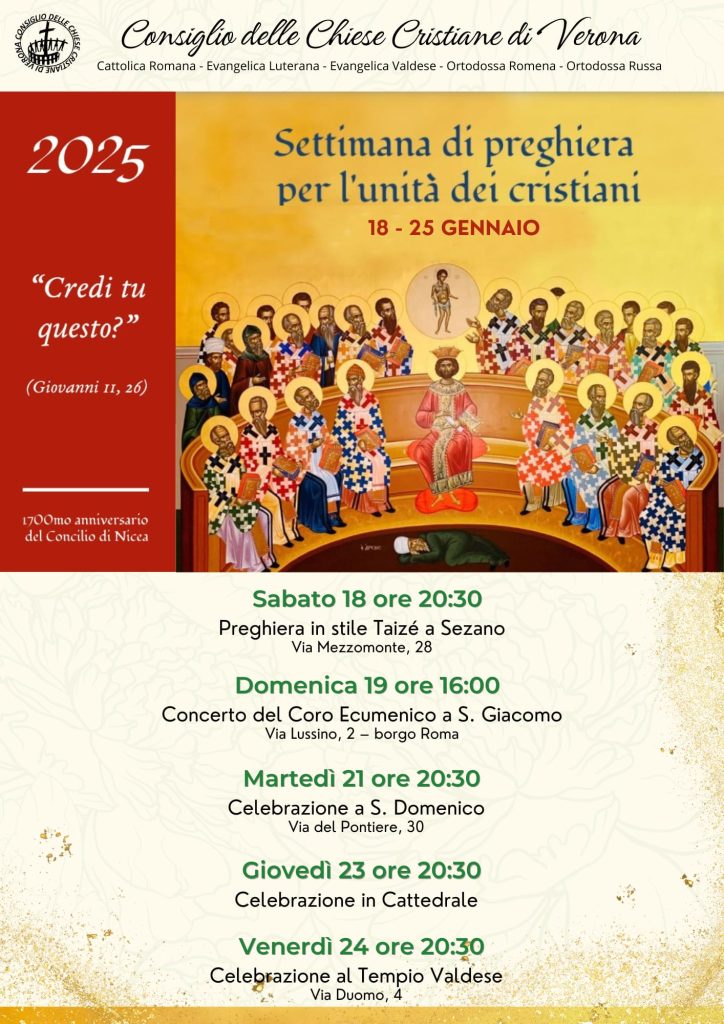 Il Consiglio delle Chiese cristiane di Verona (cattolica romana – evangelica luterana – evangelica valdese – ortodossa romena – ortodossa russa) ha predisposto questa serie di appuntamenti aperti a tutti: