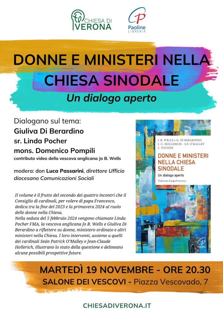 Il prossimo martedì 19 novembre alle ore 20:30, presso il Salone dei Vescovi in Piazza Vescovado 7 a Verona, si terrà un incontro pubblico dal titolo “Donne e Ministeri nella Chiesa Sinodale: un dialogo aperto”. L’evento è organizzato dalla Diocesi di Verona in collaborazione con la Libreria Paoline.