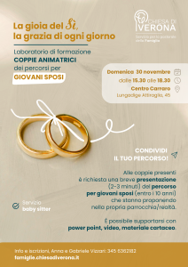 • Domenica 30 novembre, dalle 15.30 alle 18.30 – “La gioia del Sì, la grazia di ogni giorno“: laboratorio di formazione per coppie animatrici dei percorsi per giovani sposi.