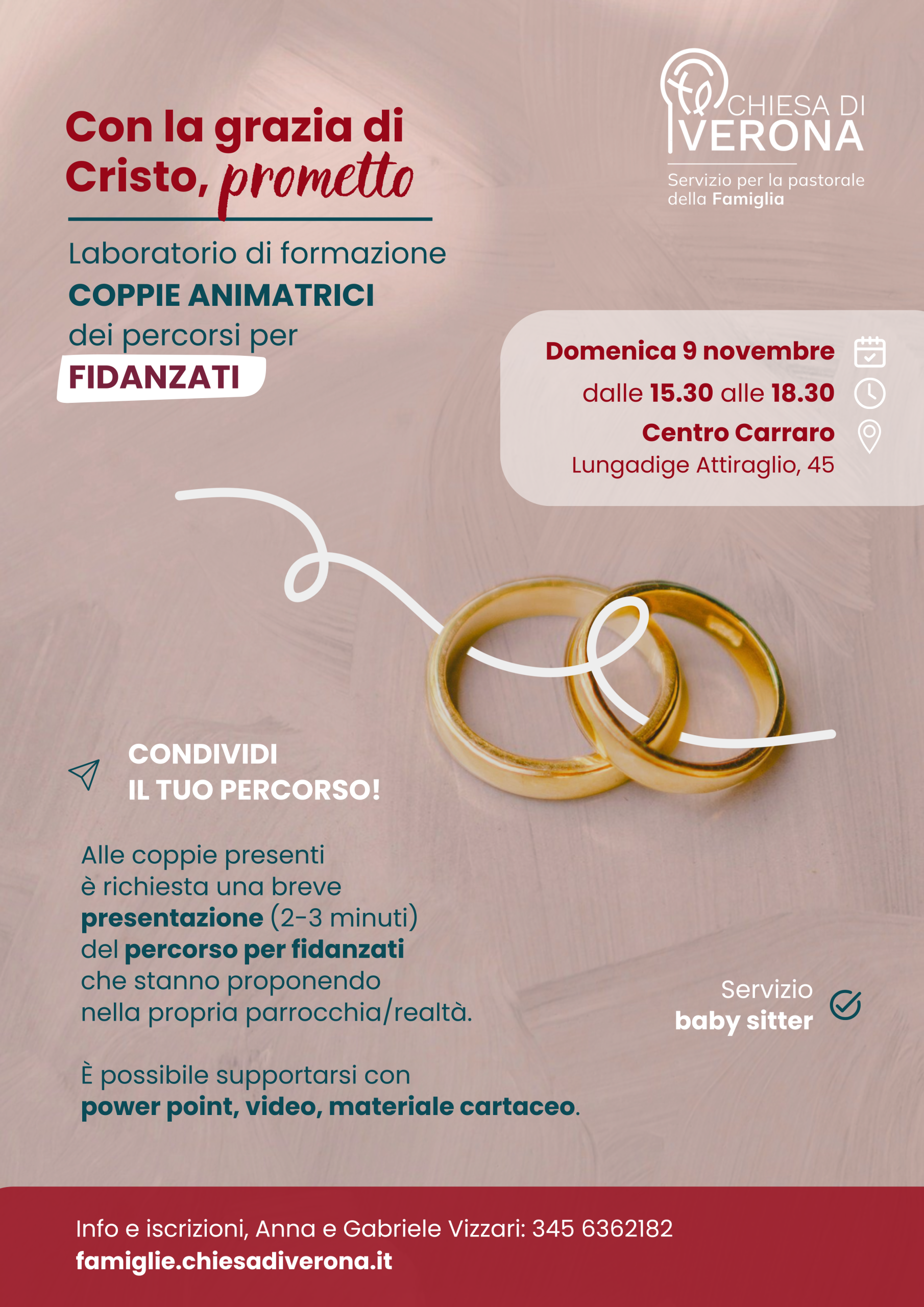 • Domenica 9 novembre, dalle 15.30 alle 18.30 – “Con la grazia di Cristo, prometto“: laboratorio di formazione per coppie animatrici dei percorsi per fidanzati;