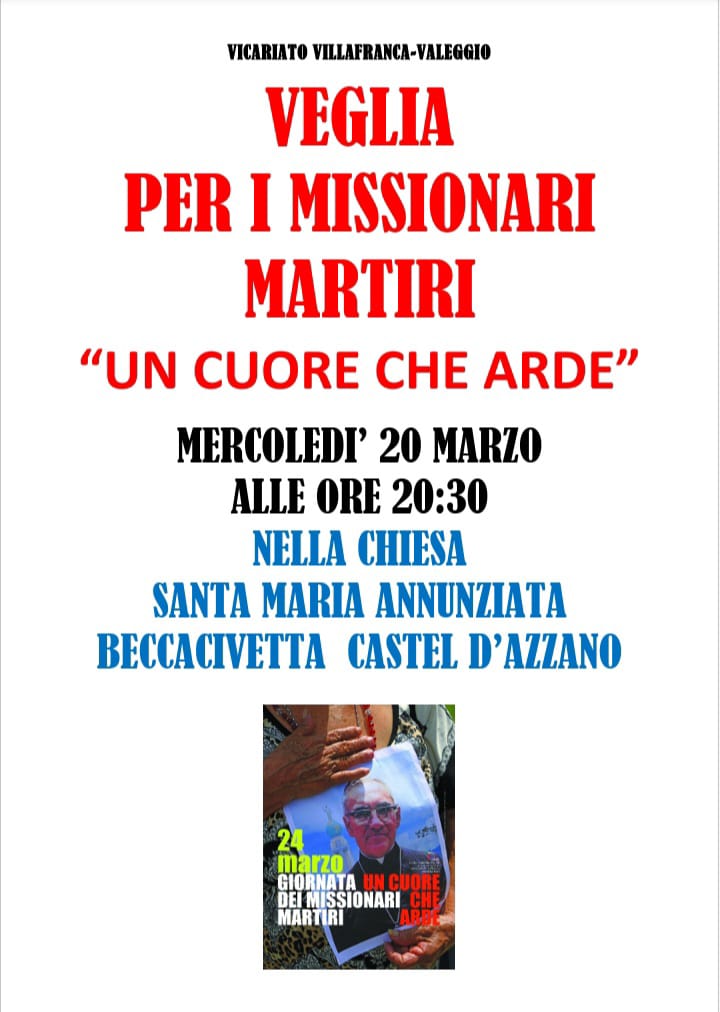 - VICARIATO DI VILLAFRANCA VALEGGIO propone alle 20.30 una veglia di preghiera nella chiesa di Beccacivetta a Castel D’Azzano