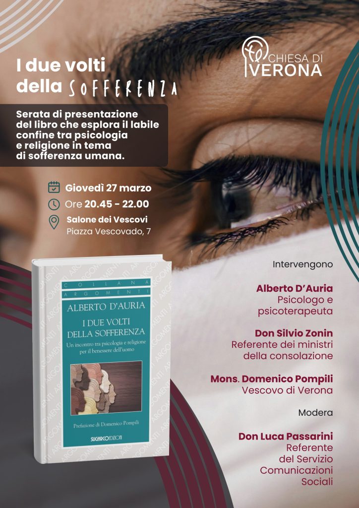 Giovedì 27 marzo 2025 alle 20.45, il Salone dei Vescovi ospiterà la presentazione del libro “I due volti della Sofferenza. Un incontro tra psicologia e religione per il benessere dell’uomo” di Alberto D’Auria.