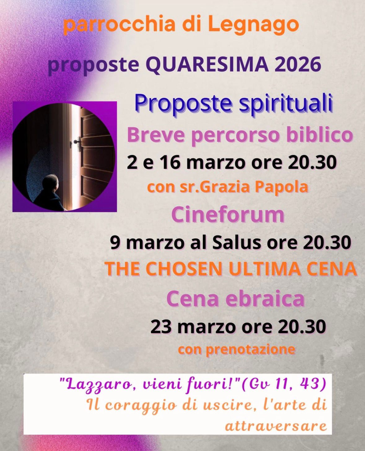 Per questo tempo di Quaresima, la parrocchia di Legnago organizza alcune proposte che possano accompagnare i fedeli nei giorni che preparano alla celebrazione della Pasqua, sulla scia del tema diocesano “Lazzaro, vieni fuori! (Gv 11, 43). Il coraggio di uscire, l’arte di attraversare“.