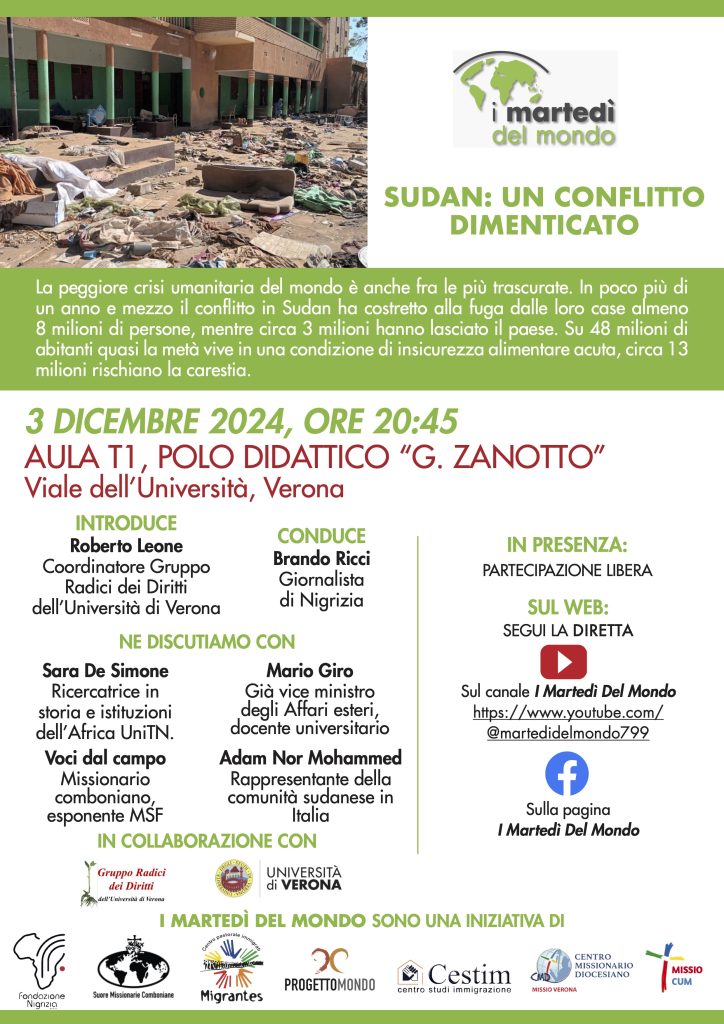 Contro il silenzio che avvolge questo tragico conflitto l’università di Verona, con il Gruppo Radici dei Diritti, ha collaborato ad organizzare un incontro, aperto alla cittadinanza, in cui si cercherà di capire cosa sta succedendo in Sudan – con analisi di esperti e voci dal campo – tentando di definire che ruolo può avere l’Italia come ambasciatrice di pace.