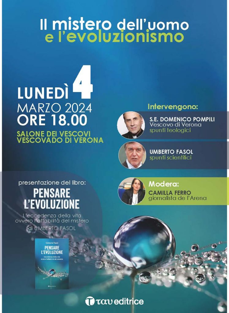 Moderato dalla giornalista de L’Arena, Camilla Ferro, l’incontro vedrà la partecipazione di S.E. Domenico Pompili, Vescovo di Verona, e di Umberto Fasol, autore del libro Pensare l’evoluzione – L’eccedenza della vita ovvero l’affabilità del mistero edito da Tau editrice, che sarà presentato nel corso dell’evento.