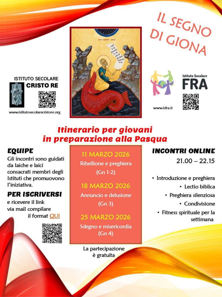 L’Istituto secolare Cristo Re propone anche quest’anno un ciclo di incontri di preghiera per giovani, in preparazione alla Pasqua. Guidati dalla lettura del libro di Giona, l’itinerario “Il segno di Giona” sarà l’occasione per riscoprire la bellezza e il dramma del profeta chiamato ad annunciare alla città il vero volto del Dio di misericordia.