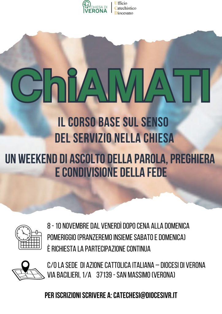 A proporlo è il Servizio catechistico diocesano e si svolgerà dalla sera di venerdì 8 novembre al pomeriggio di domenica 10 novembre nella casa pastorale Giovanni Paolo II in via Bacilieri 1/A, a San Massimo (Verona) dove ha sede anche l’Azione Cattolica di Verona.