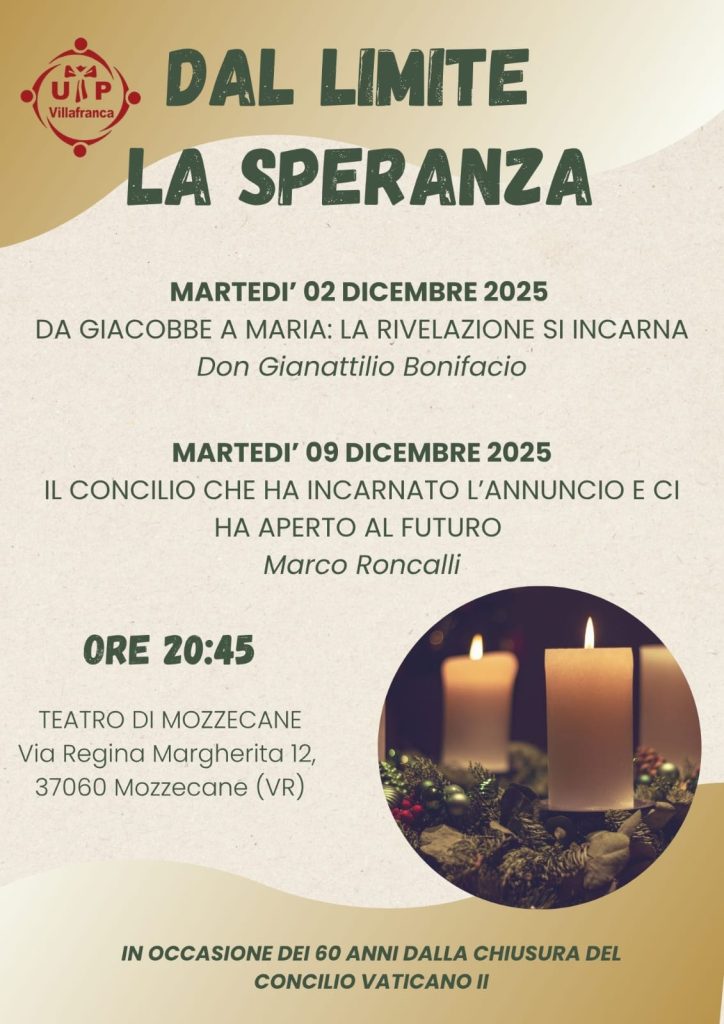 In occasione dei 60 anni dalla chiusura del Concilio Vaticano II che ha riformato la liturgia, l’Unità Pastorale di Villafranca propone due serate “Dal limite la speranza“, che si svolgeranno presso il Teatro di Mozzecane nel pieno del periodo di Avvento.