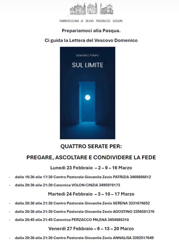 Le parrocchie di Zevio, Perzacco e Volon propongono alcuni percorsi di quattro serate in preparazione alla Pasqua, incentrati sul tema della lettera pastorale “Sul limite” del vescovo Domenico Pompili. Un’occasione per pregare, ascoltare e condividere la propria fede orientandosi nel tempo quaresimale.