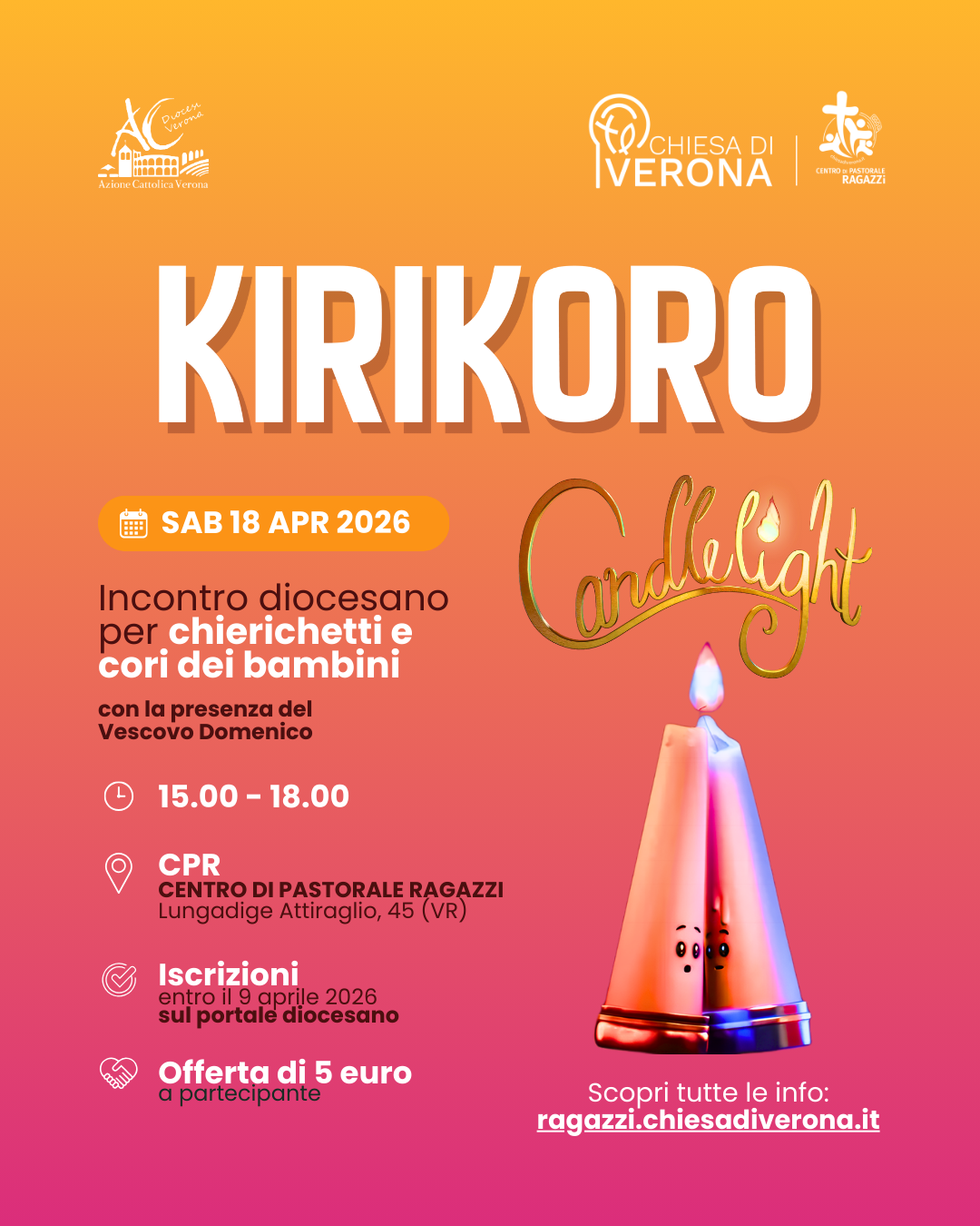 Sabato 18 aprile, il Centro di Pastorale Ragazzi della Diocesi di Verona e l’ACR diocesana invitano tutti i bambini e le bambine che svolgono servizio in parrocchia come chierichetti o cantando nei cori a partecipare all’incontro diocesano “KiriKoro“: un pomeriggio di festa e condivisione pensato per loro, con la partecipazione del vescovo Domenico.