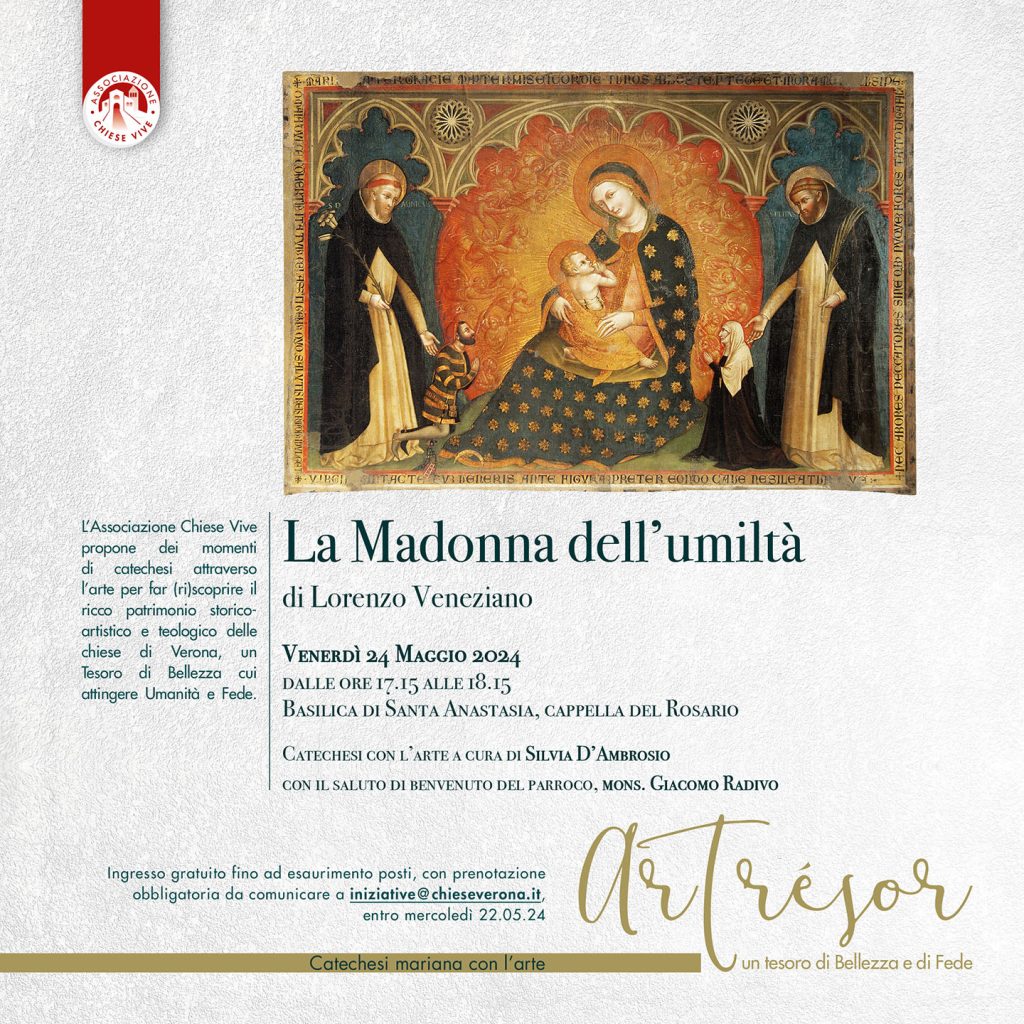 Artrésor propone una catechesi con l’arte davanti al capolavoro di Lorenzo Veneziano “La Madonna dell’umiltà” conservato nella Cappella del Rosario della Basilica di Sant’Anastasia. L’appuntamento è per venerdì 24 maggio alle 17,15 con Silvia d’Ambrosio e il saluto di benvenuto del parroco Mons. Giacomo Radivo.
