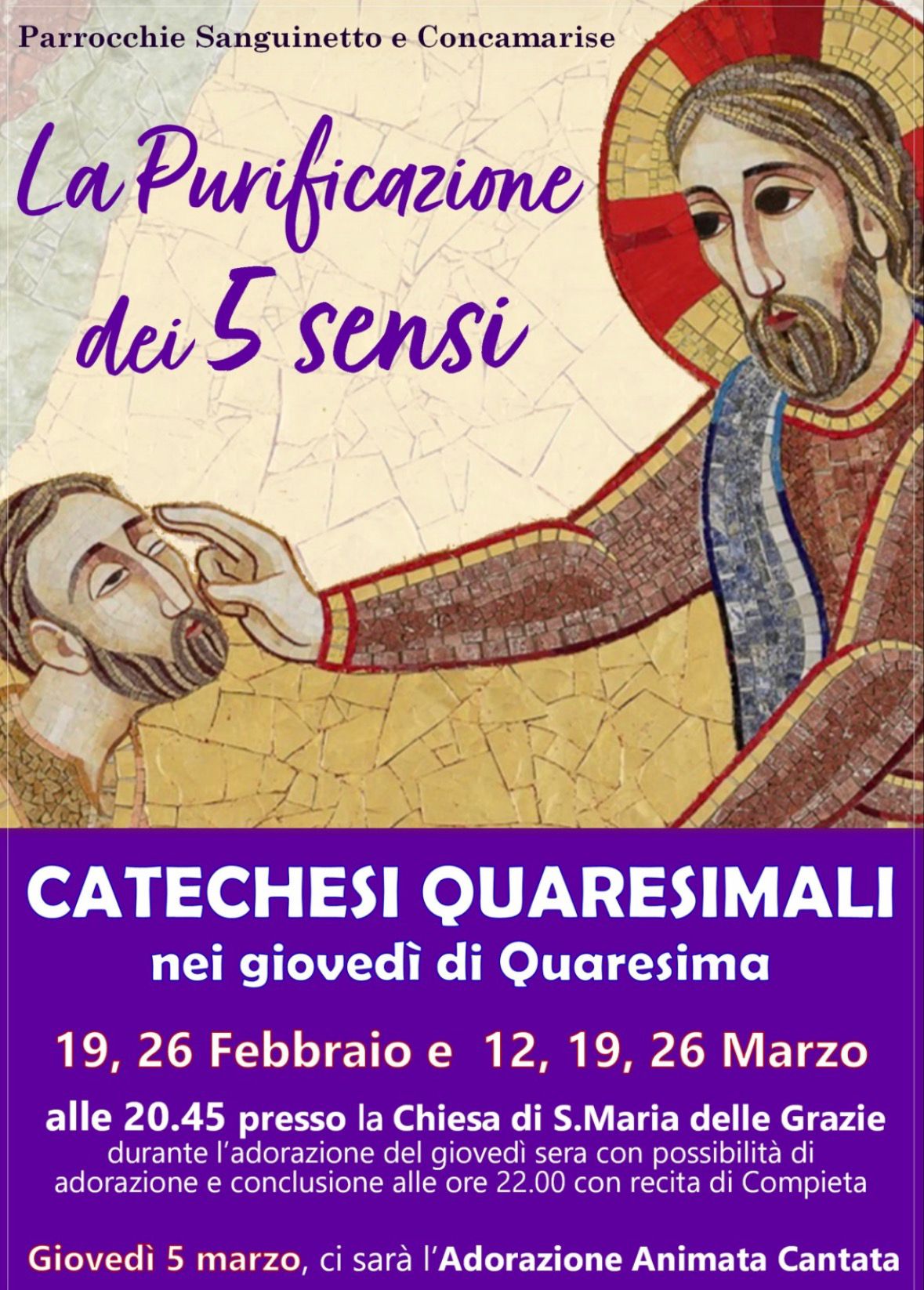 In questo tempo di Quaresima, la parrocchia Santa Maria delle Grazie di Sanguinetto propone il giovedì sera un percorso di catechesi per adulti dal titolo La purificazione dei 5 sensi.