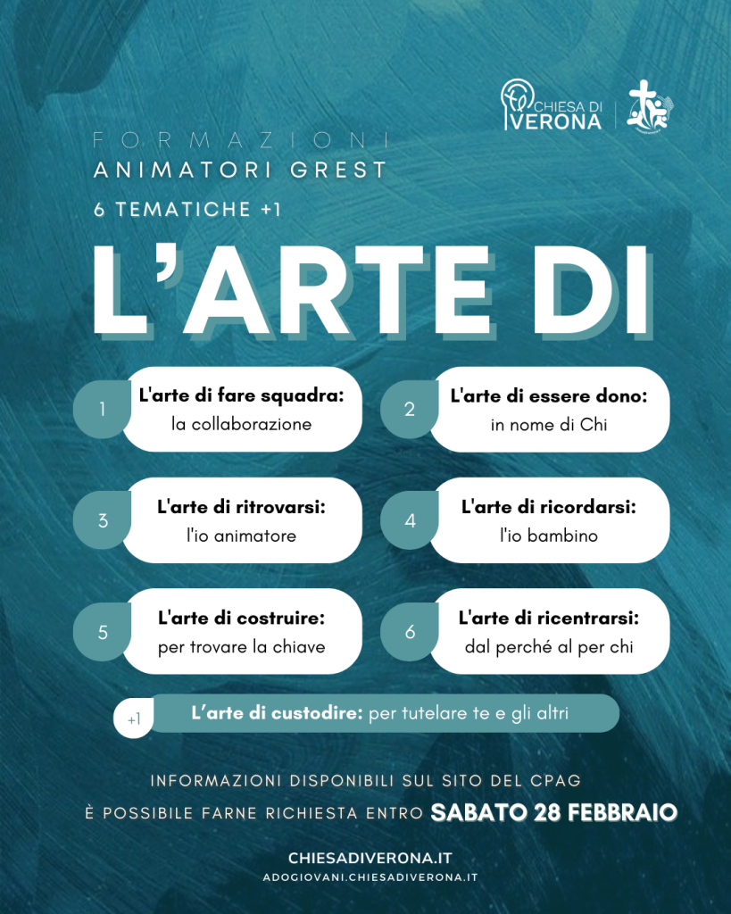 Per ulteriori dettagli e richiedere la formazione per il proprio Grest, scrivere una mail entro sabato 28 febbraio a info@giovaniverona.it, lasciando i propri contatti (telefono e mail). Nei giorni successivi un volontario del Progetto Formazione Grest si metterà in contatto con gli interessati per prendere accordi.