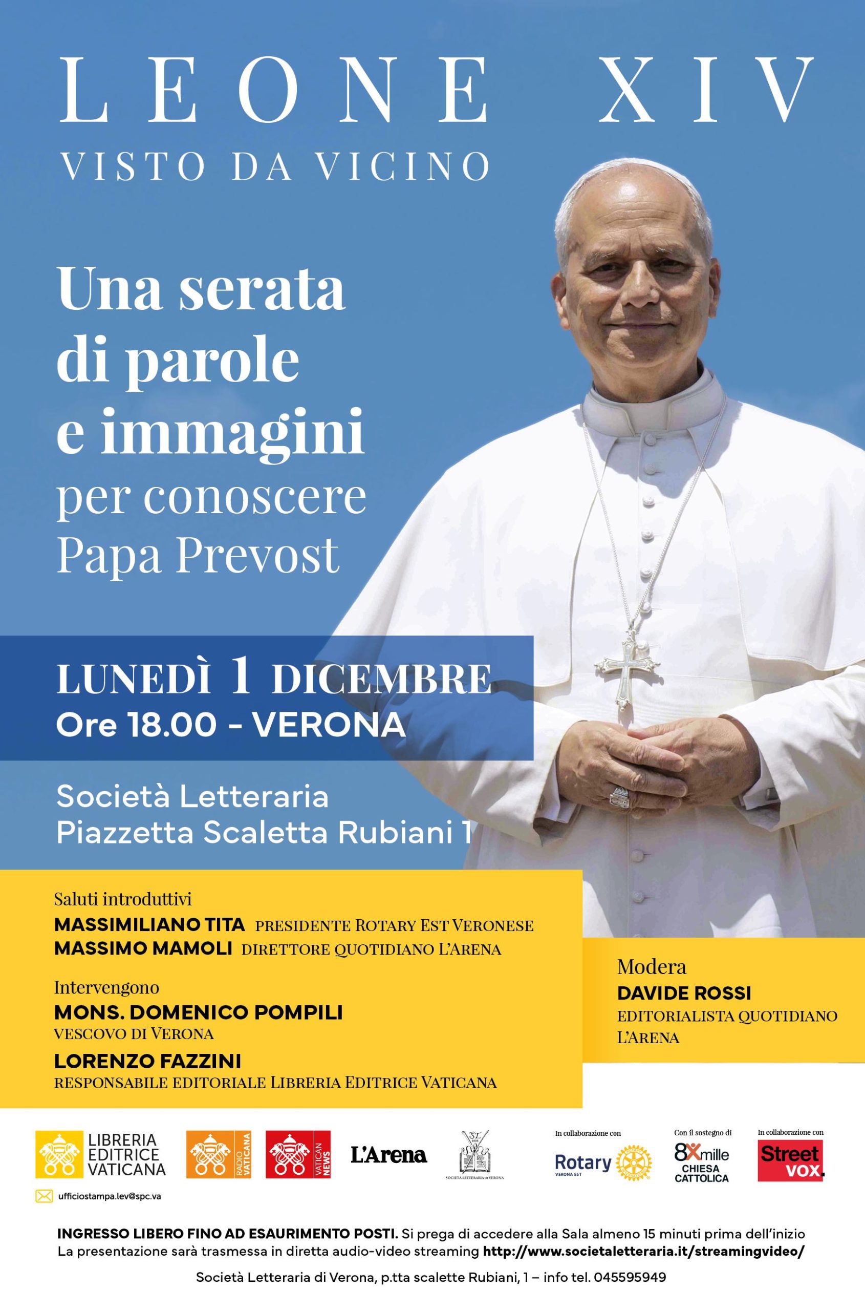 Lunedi 1° dicembre alle 18.00, presso la Società Letteraria di Verona si parlerà di papa Leone XIV in occasione dei suoi primi sei mesi di pontificato.