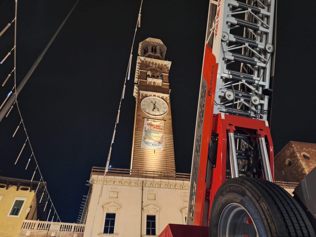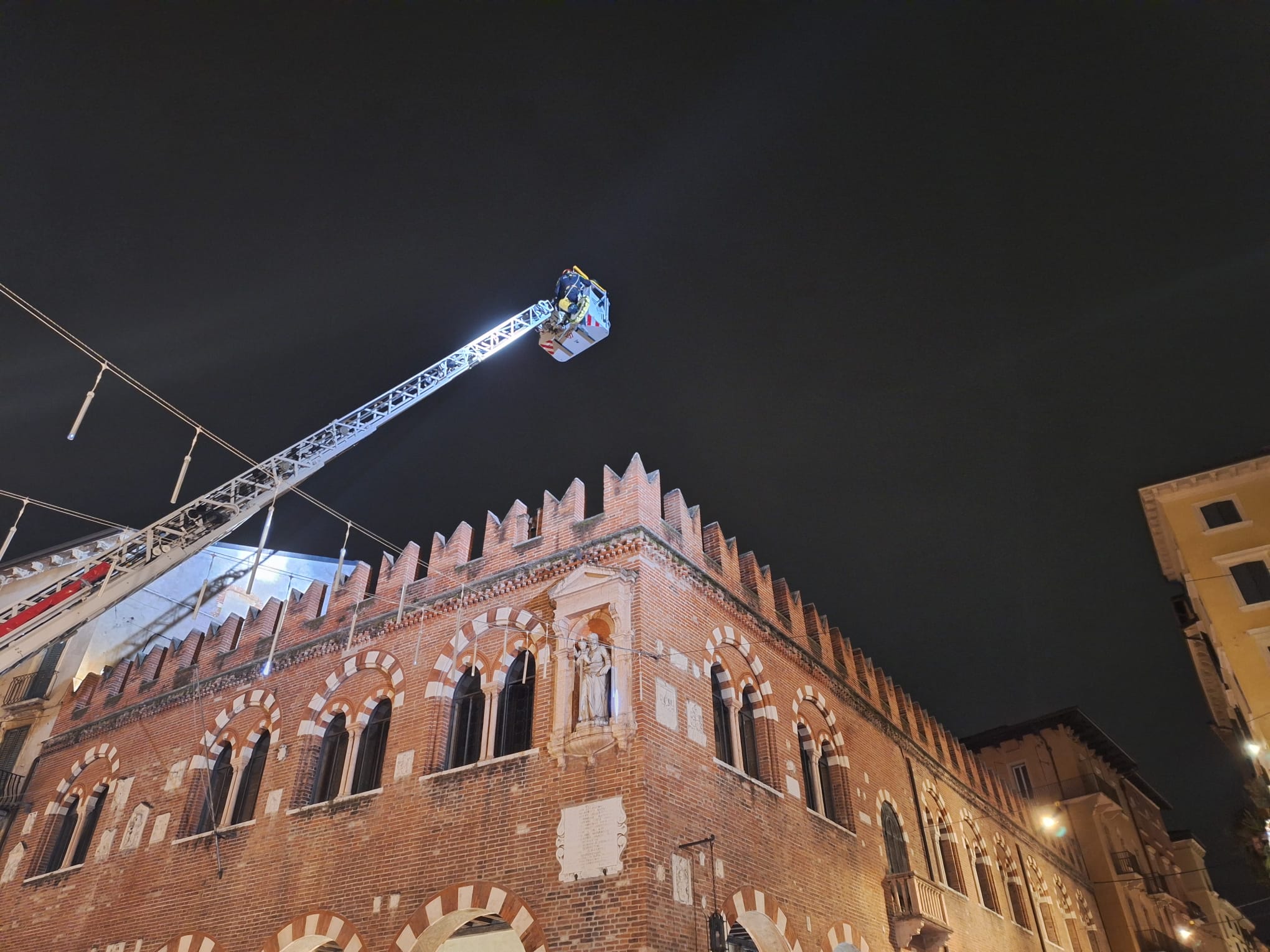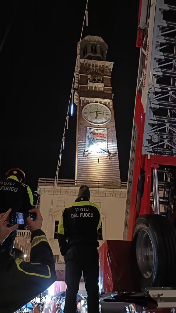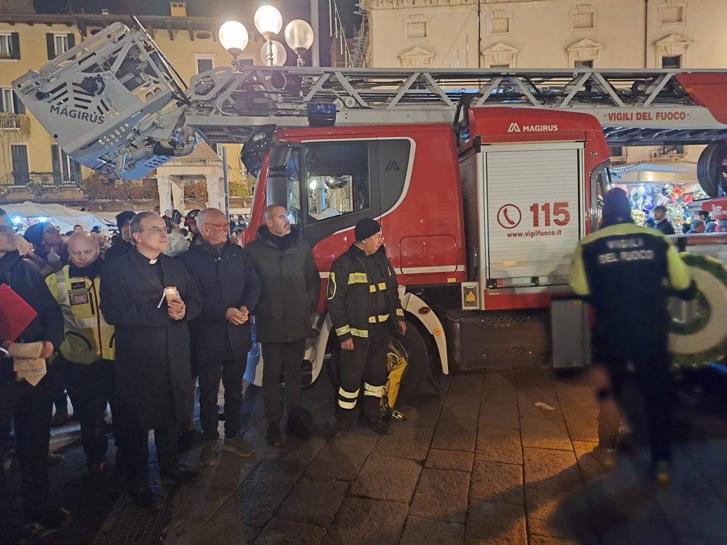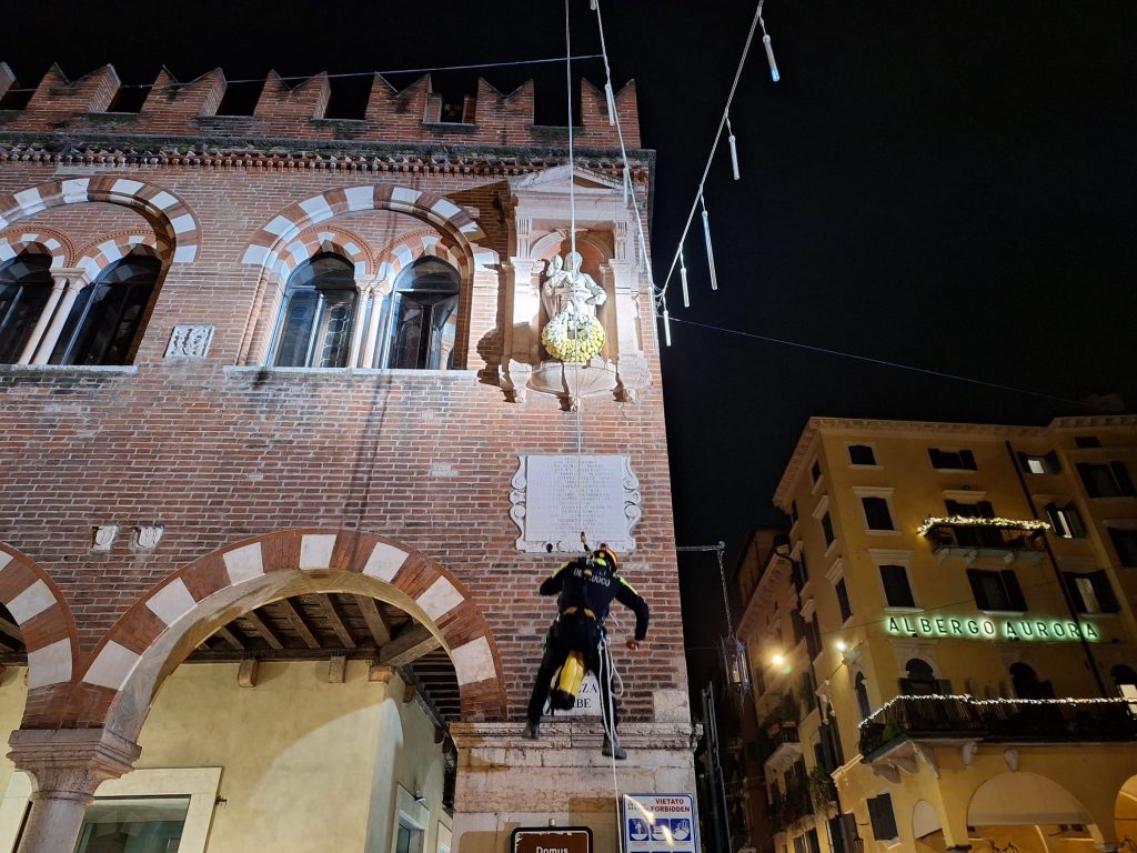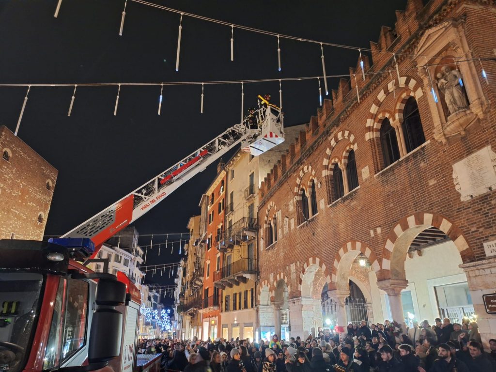 Prima della benedizione del Vescovo Domenico, alla presenza delle autorità e di centinaia di persone che gremivano la piazza, i Vigili del fuoco si sono calati dalla volata dell’autoscala per deporre una corona di fiori ai piedi della statua. Subito dopo, accompagnati dal suono della banda, sono scesi dalla cima della Torre dei Lamberti per srotolare l’imponente striscione che porta i saluti dei Vigili del Fuoco e del Comune di Verona per le festività natalizie e che rimarrà esposto per l’intera durata del periodo festivo.