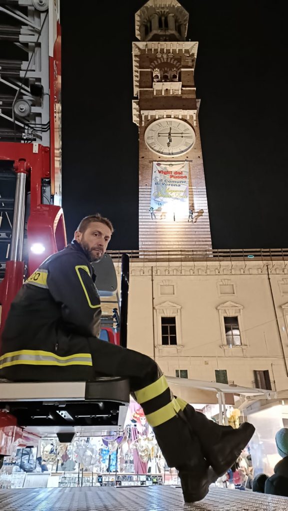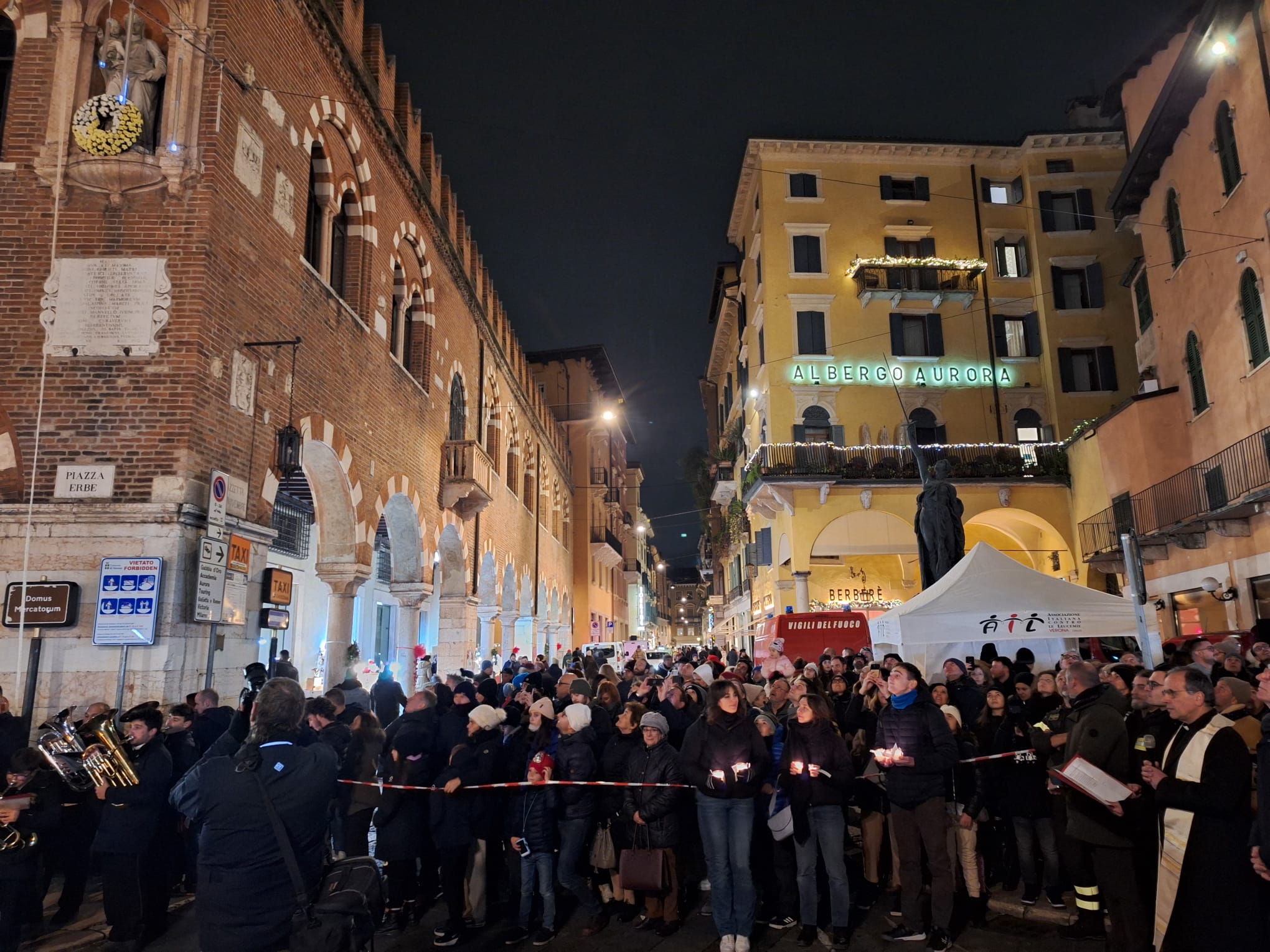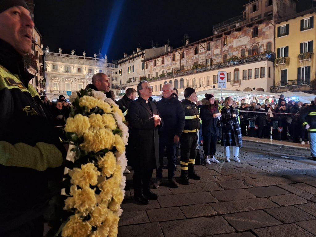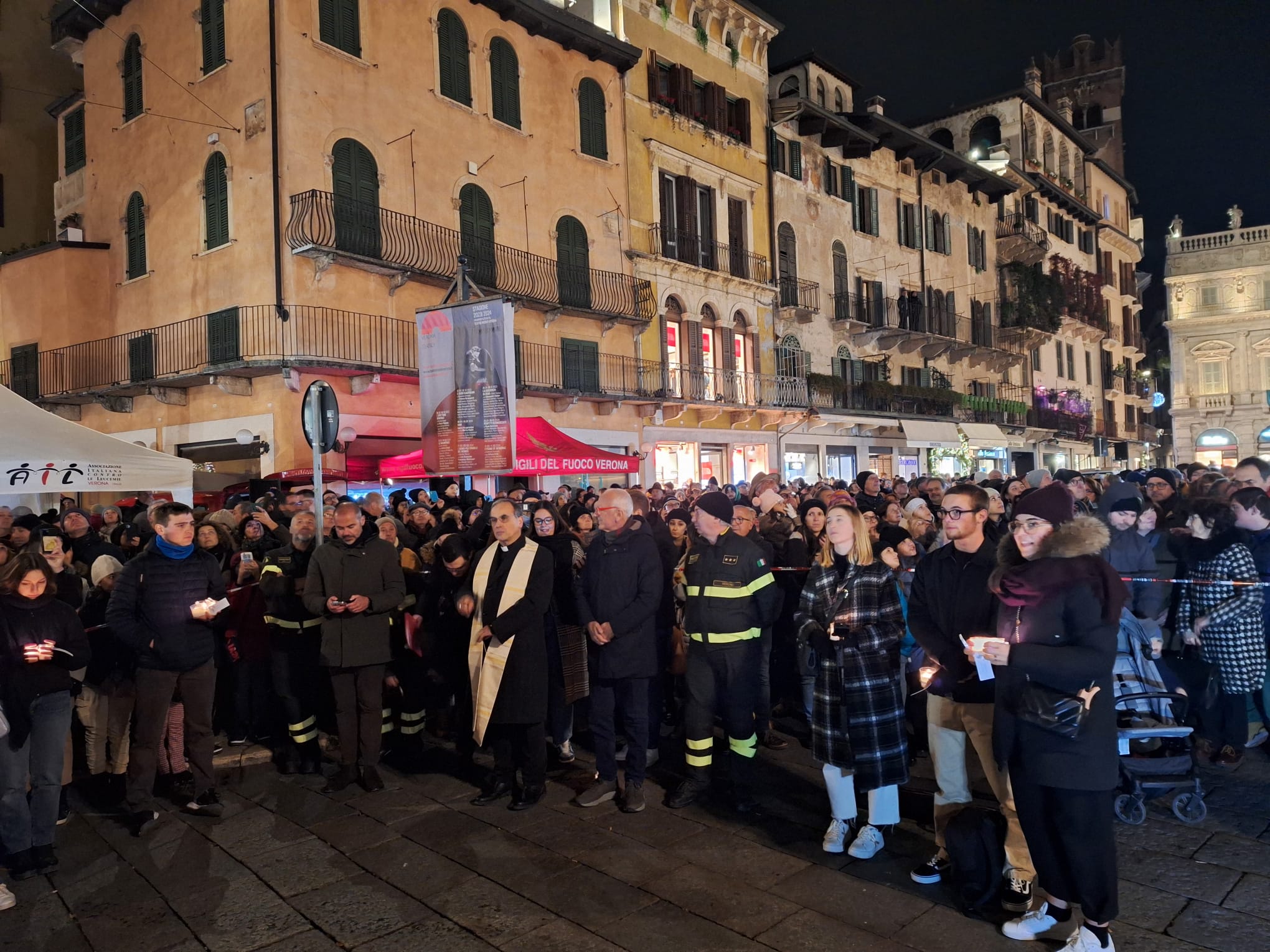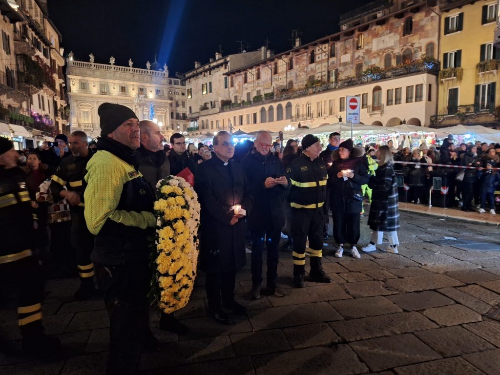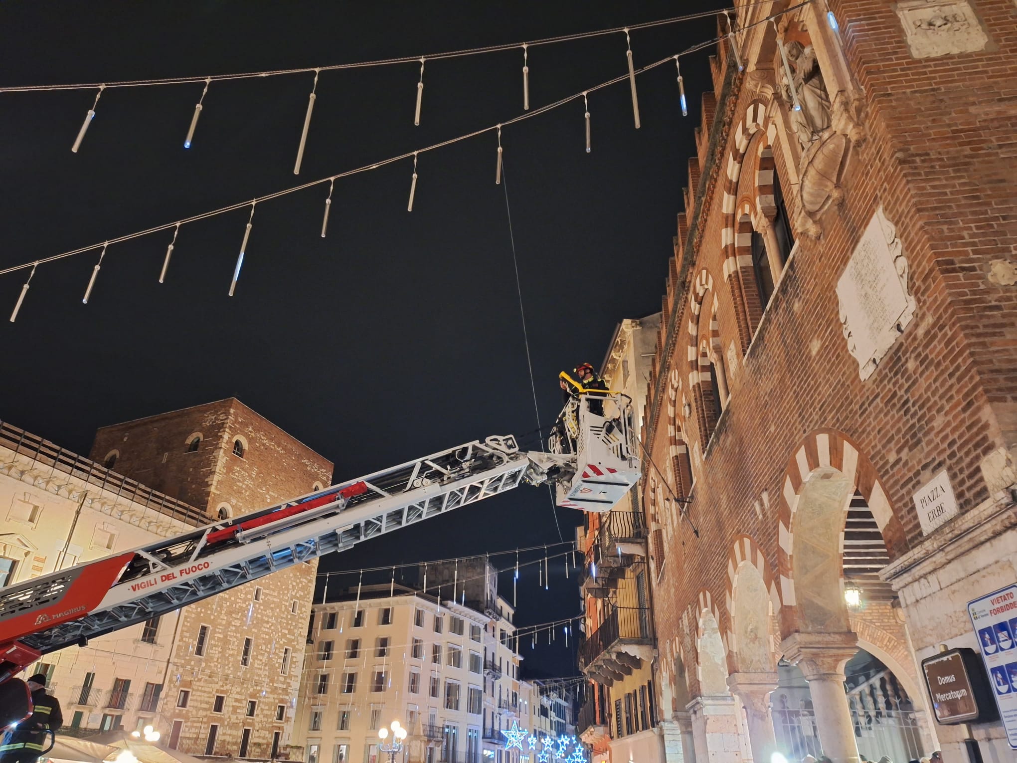 Prima della benedizione del Vescovo Domenico, alla presenza delle autorità e di centinaia di persone che gremivano la piazza, i Vigili del fuoco si sono calati dalla volata dell’autoscala per deporre una corona di fiori ai piedi della statua. Subito dopo, accompagnati dal suono della banda, sono scesi dalla cima della Torre dei Lamberti per srotolare l’imponente striscione che porta i saluti dei Vigili del Fuoco e del Comune di Verona per le festività natalizie e che rimarrà esposto per l’intera durata del periodo festivo.