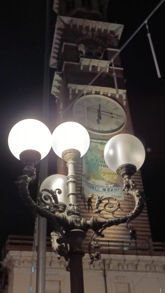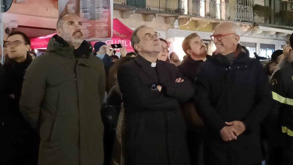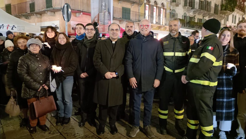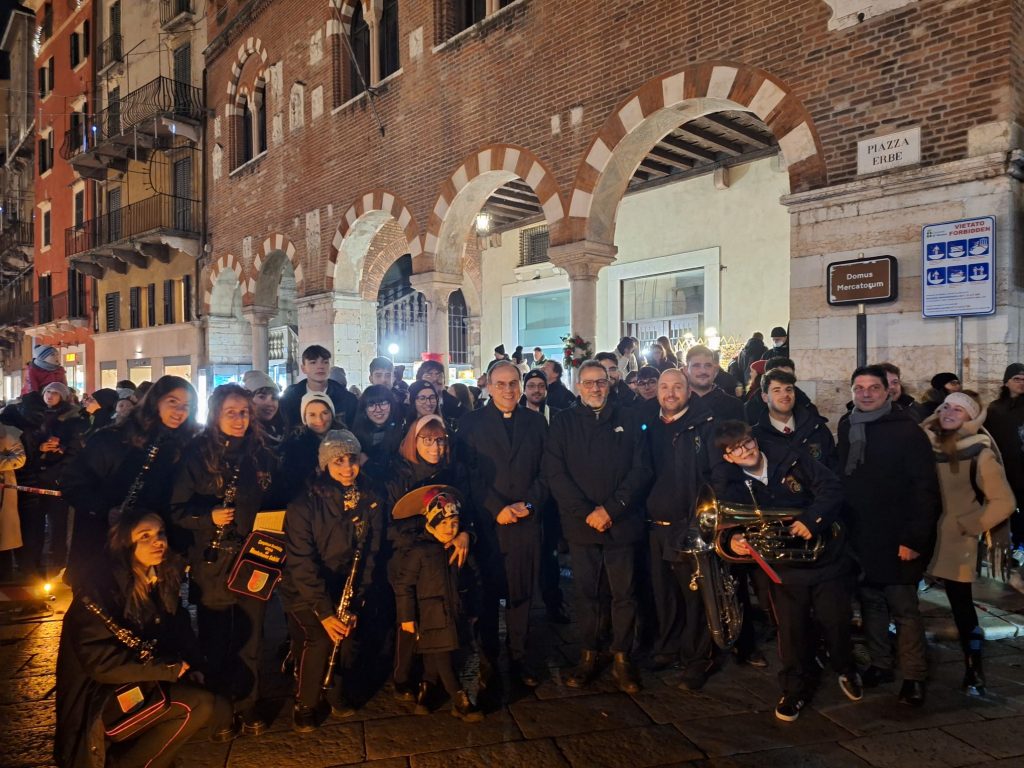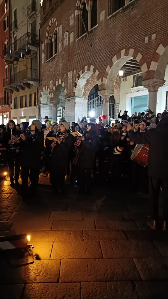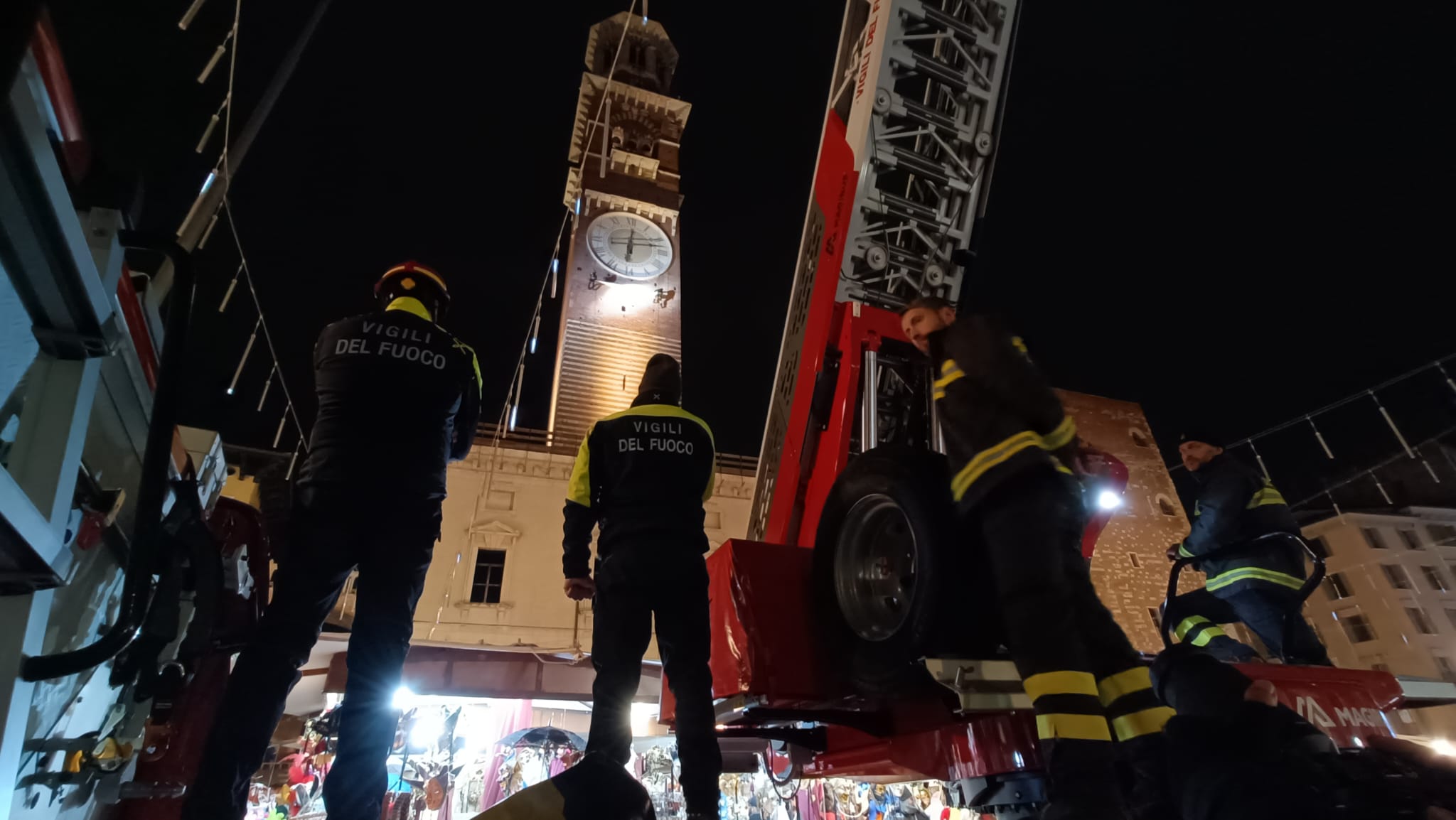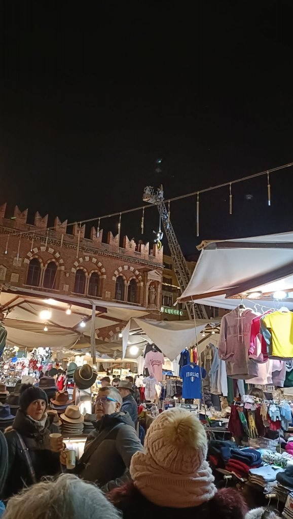 Prima della benedizione del Vescovo Domenico, alla presenza delle autorità e di centinaia di persone che gremivano la piazza, i Vigili del fuoco si sono calati dalla volata dell’autoscala per deporre una corona di fiori ai piedi della statua. Subito dopo, accompagnati dal suono della banda, sono scesi dalla cima della Torre dei Lamberti per srotolare l’imponente striscione che porta i saluti dei Vigili del Fuoco e del Comune di Verona per le festività natalizie e che rimarrà esposto per l’intera durata del periodo festivo.