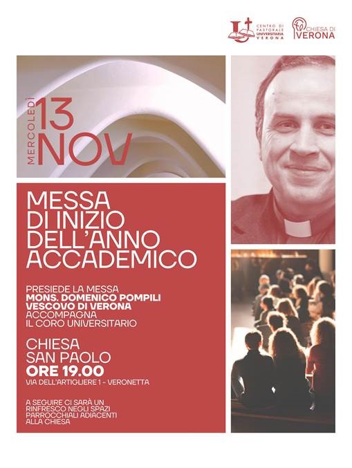 La celebrazione, presieduta dal vescovo di Verona Mons. Domenico Pompili, inizierà alle ore 19.00 e sarà accompagnata dal coro universitario, creando un’atmosfera di raccoglimento e riflessione per gli studenti e gli operatori del mondo dell’università.