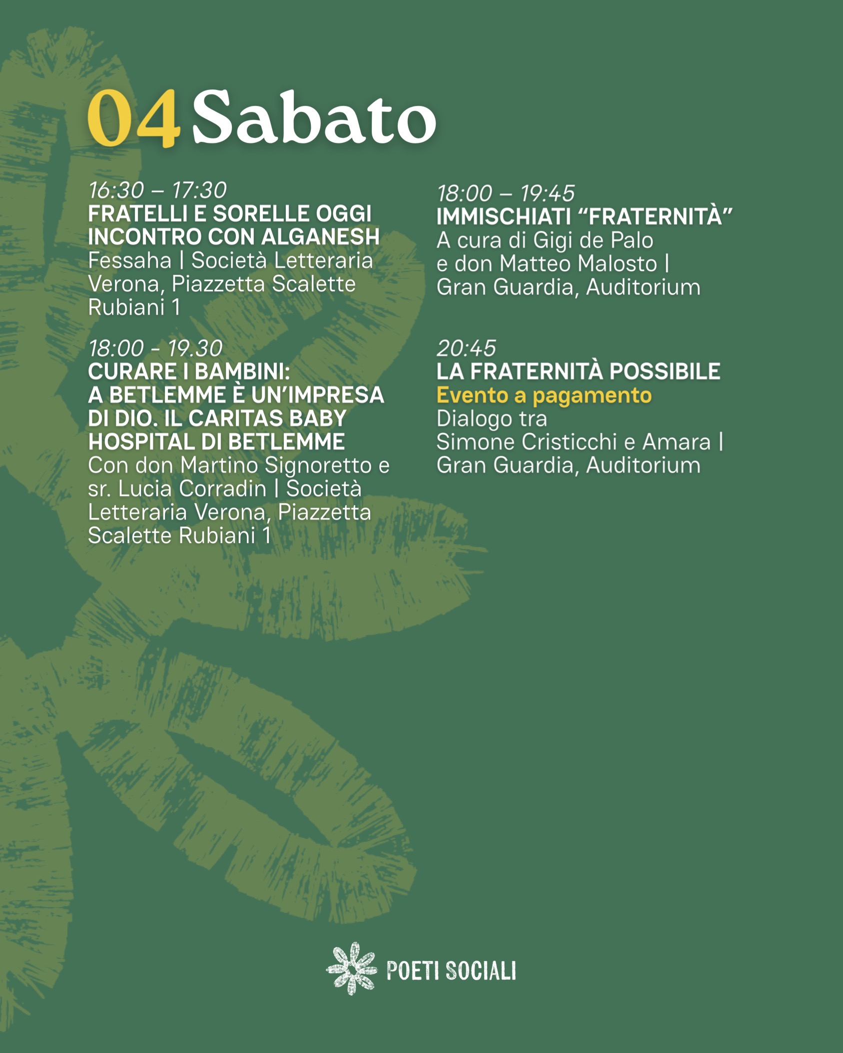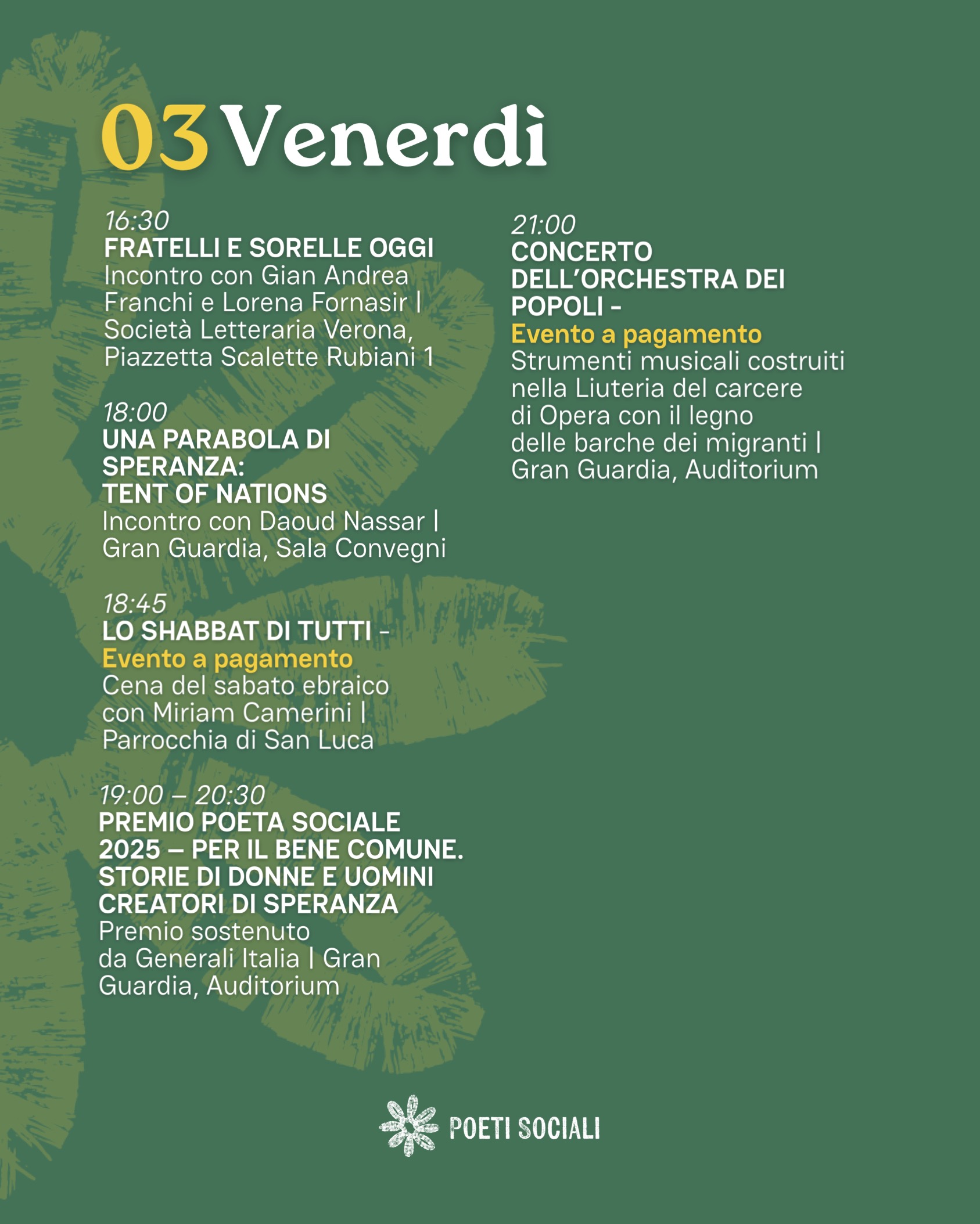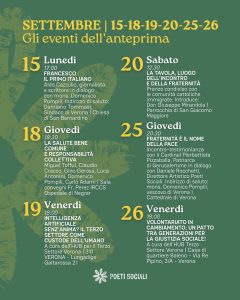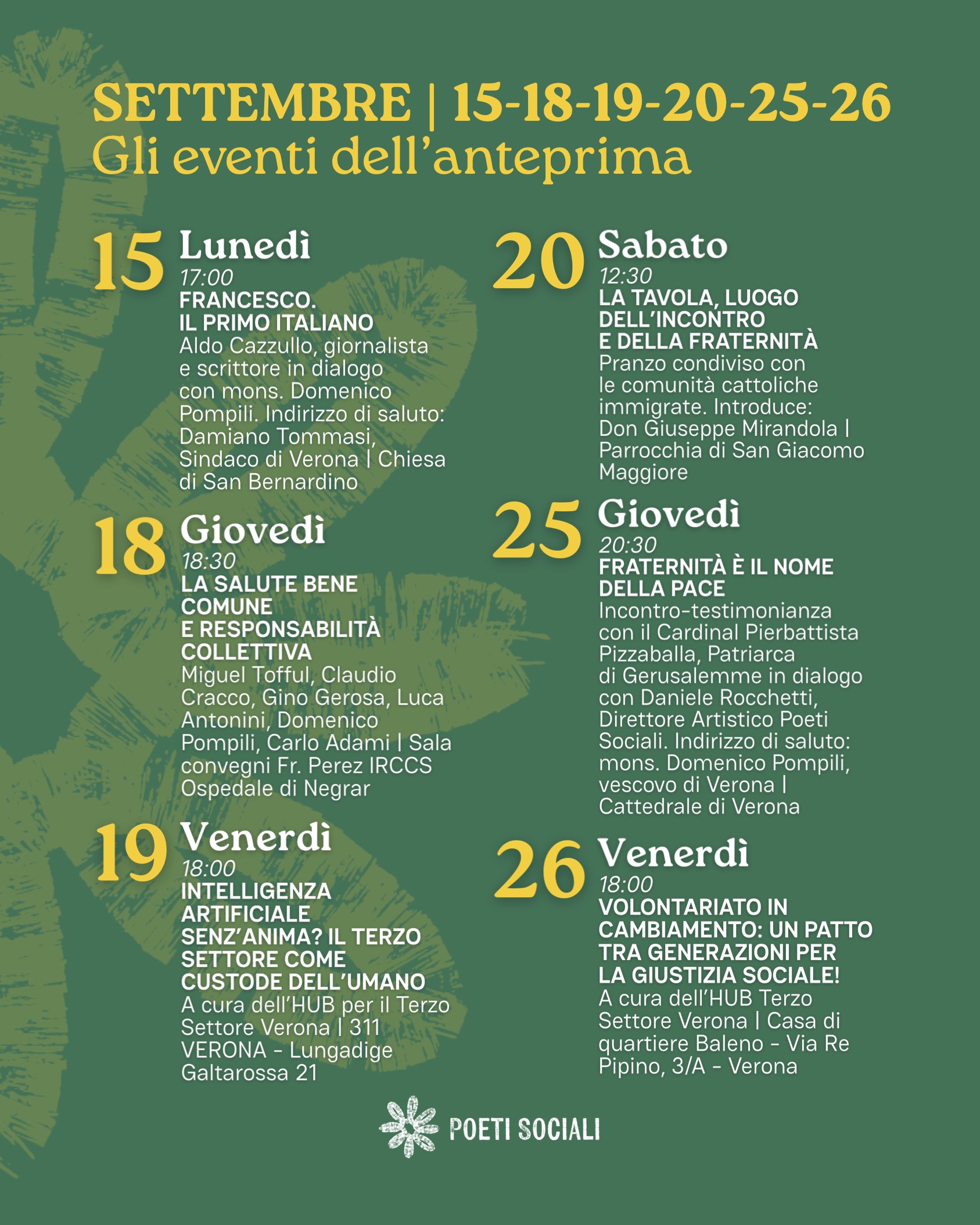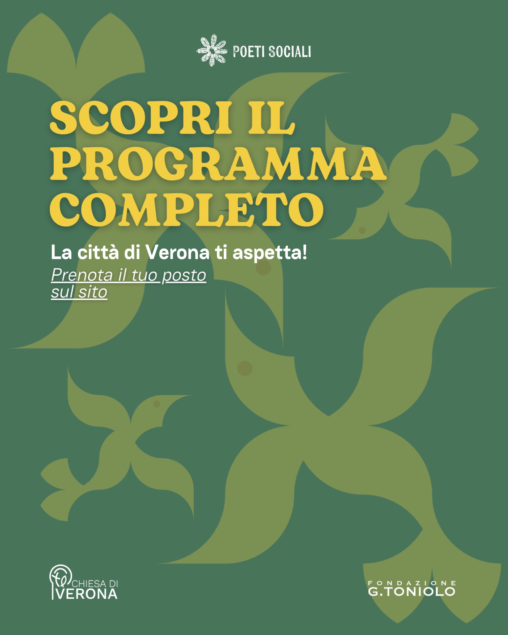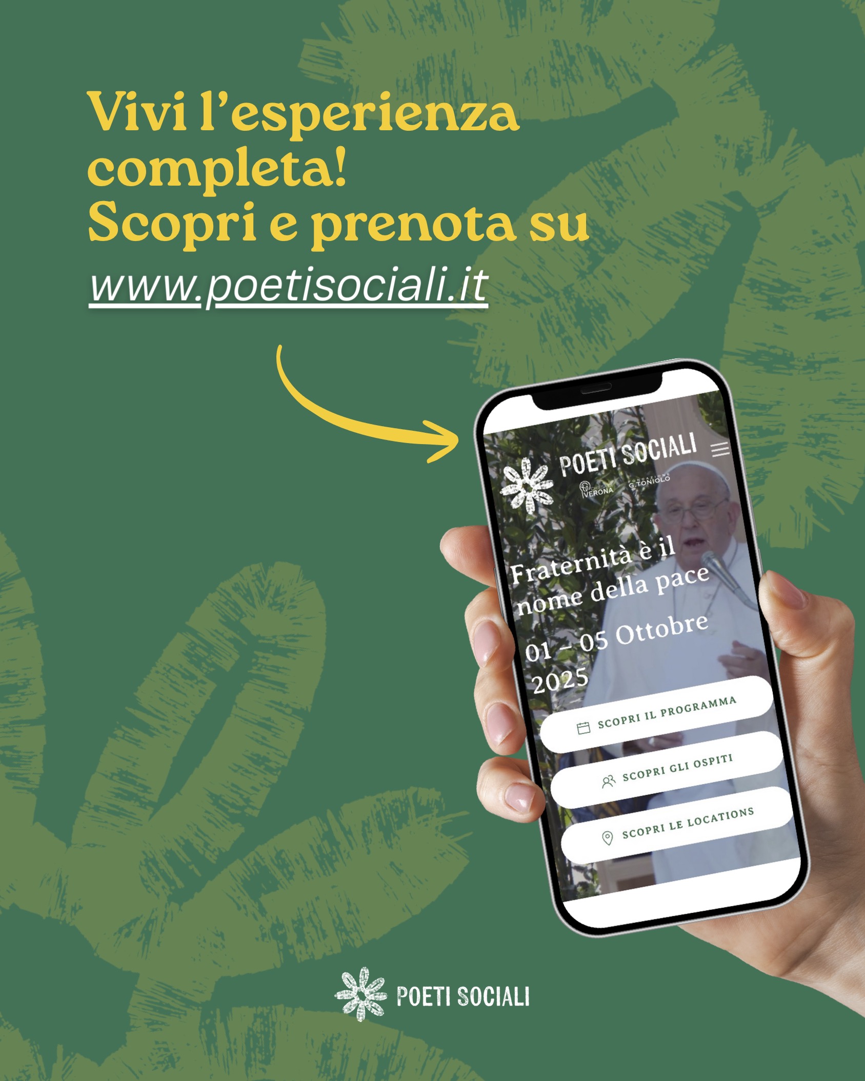 In continuità con la visita di papa Francesco a Verona e l’incontro dei movimenti popolari con papa Leone del 30 maggio scorso, Poeti Sociali continua un percorso iniziato in occasione dell’Arena di Pace 2024: una proposta culturale aperta e plurale ispirata al Vangelo che vuole incrociare i molti temi del dibattito pubblico contemporaneo: dalla pace all’ambiente, dalle migrazioni al diritto internazionale, dal Medio Oriente ai Balcani, dall’economia, alla salute, all’intelligenza artificiale che sfidano la fraternità oggi. Circa sessanta eventi con la partecipazione di un centinaio di ospiti, che offre occasioni di riflessione e di confronto per aprire brecce di speranza.