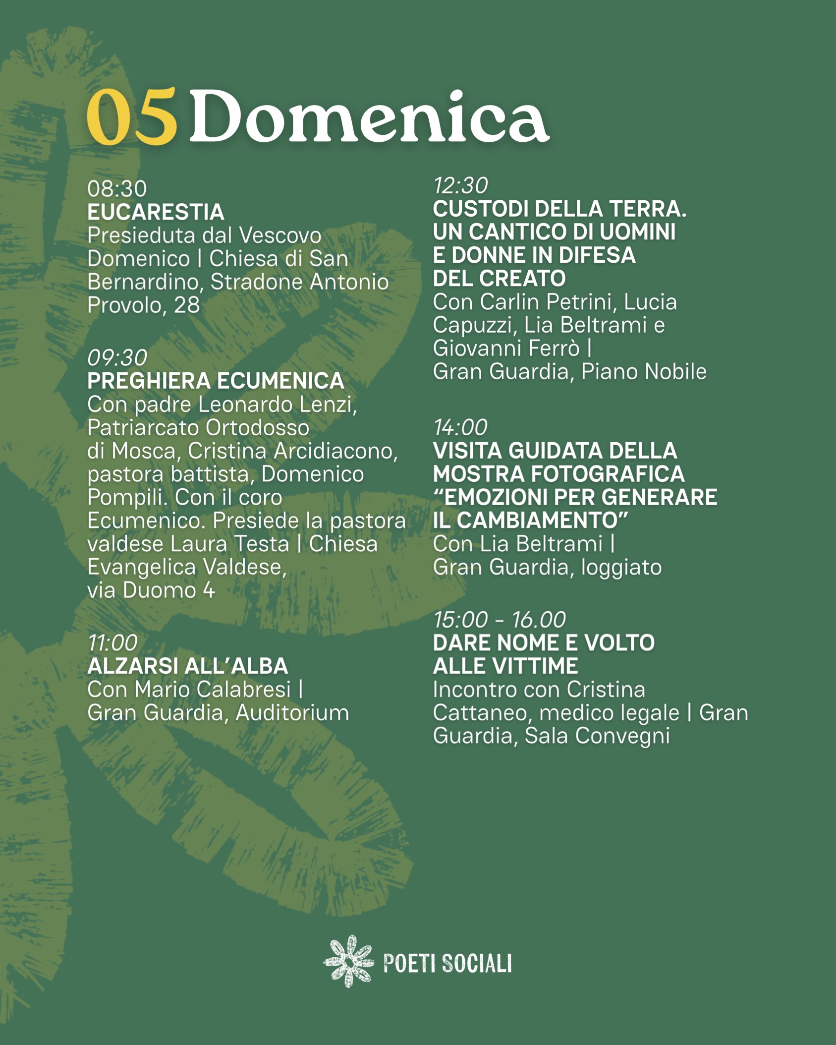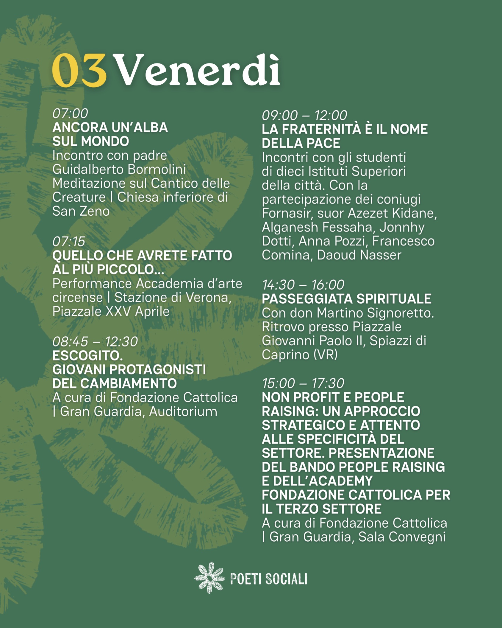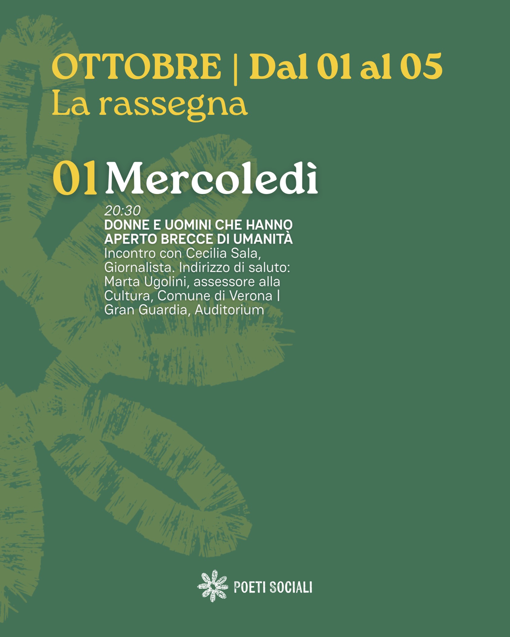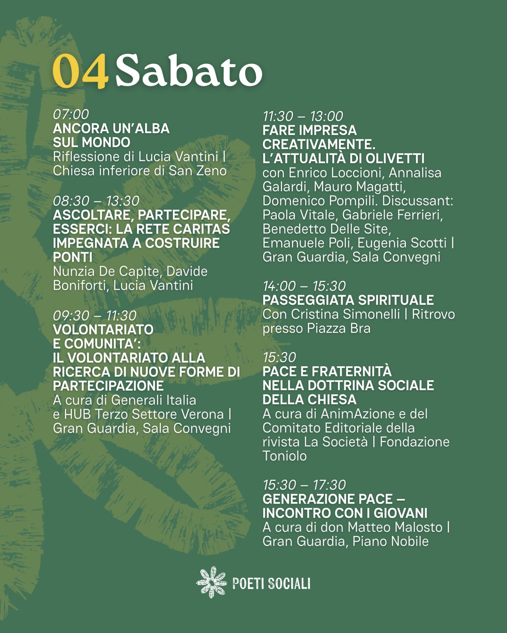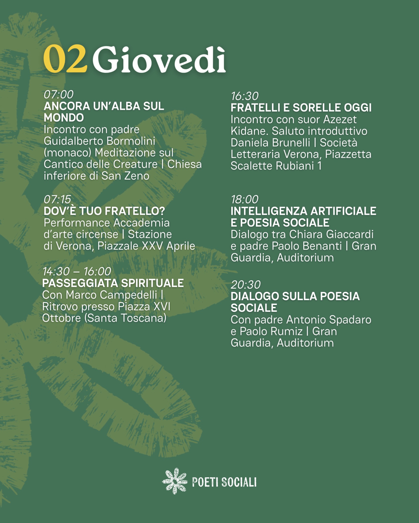 In continuità con la visita di papa Francesco a Verona e l’incontro dei movimenti popolari con papa Leone del 30 maggio scorso, Poeti Sociali continua un percorso iniziato in occasione dell’Arena di Pace 2024: una proposta culturale aperta e plurale ispirata al Vangelo che vuole incrociare i molti temi del dibattito pubblico contemporaneo: dalla pace all’ambiente, dalle migrazioni al diritto internazionale, dal Medio Oriente ai Balcani, dall’economia, alla salute, all’intelligenza artificiale che sfidano la fraternità oggi. Circa sessanta eventi con la partecipazione di un centinaio di ospiti, che offre occasioni di riflessione e di confronto per aprire brecce di speranza.