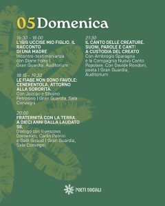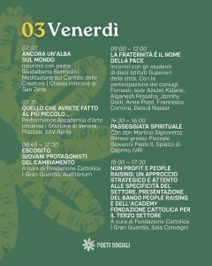 Poeti Sociali è una rassegna di eventi con cui raccontare speranza laddove appaiono solo scarto ed esclusione. Sono storie, musiche e poesie, incontri con testimoni, spettacoli e momenti conviviali; dialoghi, idee e progetti in grado di attivare percorsi personali e comunitari. Sono proposte e iniziative con linguaggi diversi, in location insolite, istituzionali e informali, che si svolgono in chiese e piazze, scuole, centri culturali e sale pubbliche.