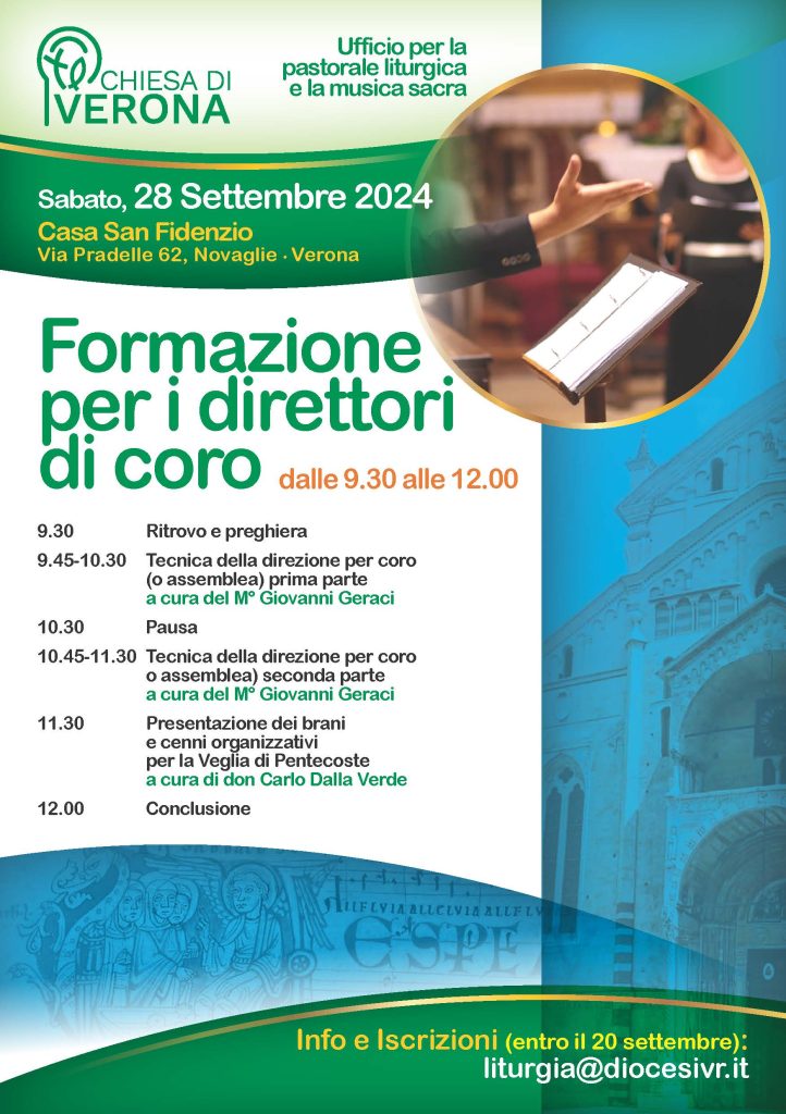 Il 28 settembre 2024, presso Casa San Fidenzio a Verona, si terrà una giornata di formazione per i direttori di coro, organizzata dall’Ufficio per la pastorale liturgica e la musica sacra.