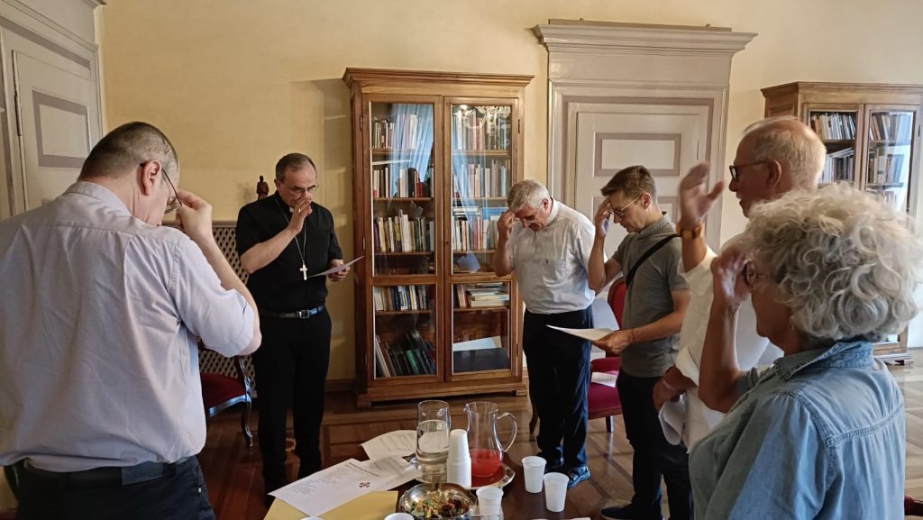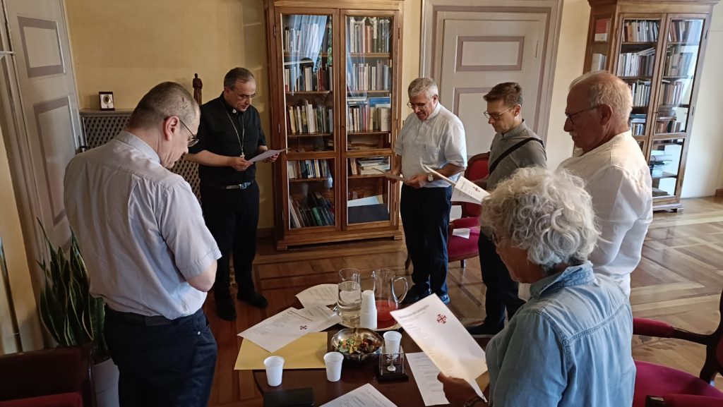 Lo scorso sabato 20 luglio in vescovado il vescovo Domenico Pompili ha impartito la benedizione del pellegrino alla delegazione composta da don Martino Signoretto, don Gino Zampieri, don Nicola Agnoli, don Andrea Anselmi, Feliciana Cortese, Guido Galvanini e Emanuela Compri.