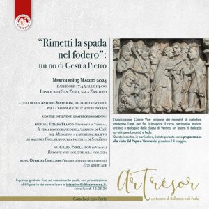 Mercoledì 15 maggio 2024 dalle ore 17.45 alle ore 19.00 si terrà l’incontro “Rimetti la spada nel fodero: un no di Gesù a Pietro”, presso la Sala Zanotto della Basilica di San Zeno. L’ingresso è gratuito fino ad esaurimento posti, ma è obbligatorio comunicare la prenotazione a iniziative@chieseverona.it.