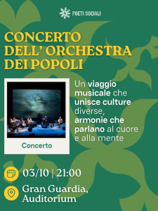 La prima serata, infine, sarà dedicata all’arte nell’auditorium della Gran Guardia: giovedì 2 poesia e letteratura con il gesuita giornalista padre Antonio Spadaro e lo scrittore viaggiatore Paolo Rumiz (inizio ore 20.30); venerdì 3 alle 21 Concerto dell’Orchestra dei Popoli; sabato 4 alle 20.45 dialogo con parole e musica tra Simone Cristicchi e Amara; domenica 5 alle 21.30 il concerto poetico Il Cantico delle Creature con Ambrogio Sparagna e i Solisti dell’Orchestra Popolare Italiana, e la partecipazione del poeta e scrittore Davide Rondoni.