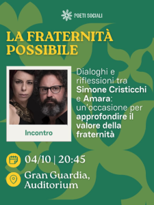 Da segnalare altri appuntamenti nelle varie sale della Gran Guardia, tra cui: “Intelligenza artificiale e poesia sociale” dialogo tra Chiara Giaccardi e padre Paolo Benanti (giovedì 2 alle 18); “Escogito. Giovani protagonisti del cambiamento” con 700 studenti delle classi 3ᵃ, 4ᵃ e 5ᵃ delle scuole superiori di Verona a cercare soluzioni alle nuove sfide e con la consegna del Premio “Giovani di Valore” (venerdì 3 dalle 8.45); “Non Profit e People Raising” workshop con la presentazione del Bando People Raising 2025 e dell’Academy Fondazione Cattolica per il Terzo Settore (venerdì 3 alle 15); “Una parabola di speranza”, incontro con Daoud Nassar della Tenda delle Nazioni, a sud di Betlemme (venerdì 3 alle 18); consegna del Premio Poeta sociale 2025 – Per il bene comune (venerdì 3 alle 19); “Donne e uomini che hanno aperto brecce di umanità” con Cecilia Sala (sabato 4 alle 11.30); “Dal Compendio al magistero di papa Leone” (sabato 4 alle 15.30); “Immischiati: Fraternità” (sabato 4 alle 18); “Alzarsi all’alba” con Mario Calabresi (domenica 5 alle 11); “Le fiabe non sono favole: Cenerentola. Attorno alla sororità” con Jacopo e Silvano Petrosino (domenica 5 alle 18.15); “Fraternità con la terra. A dieci anni dalla Laudato Si’” con il vescovo Domenico Pompili, Carlin Petrini e Gaël Giraud (domenica 5 alle 20).