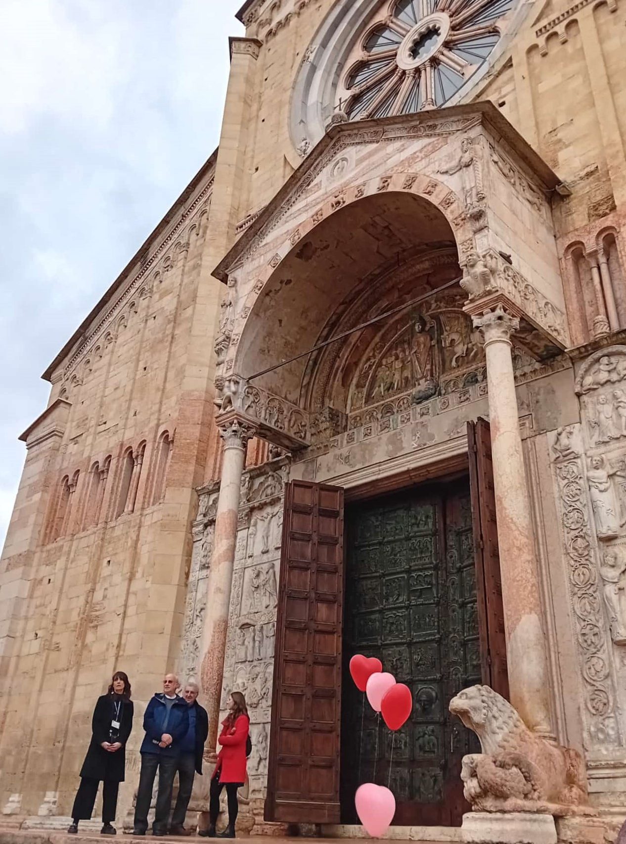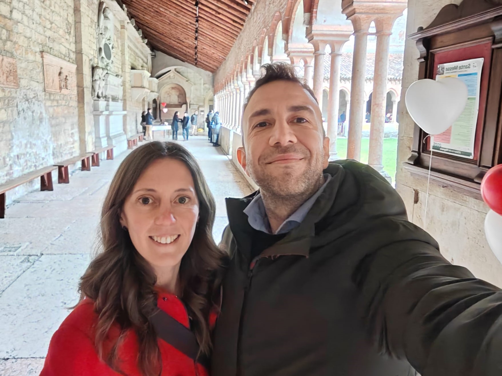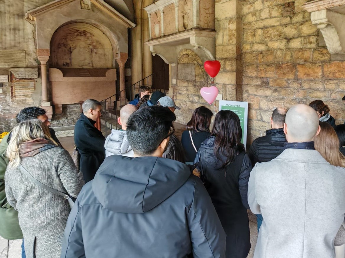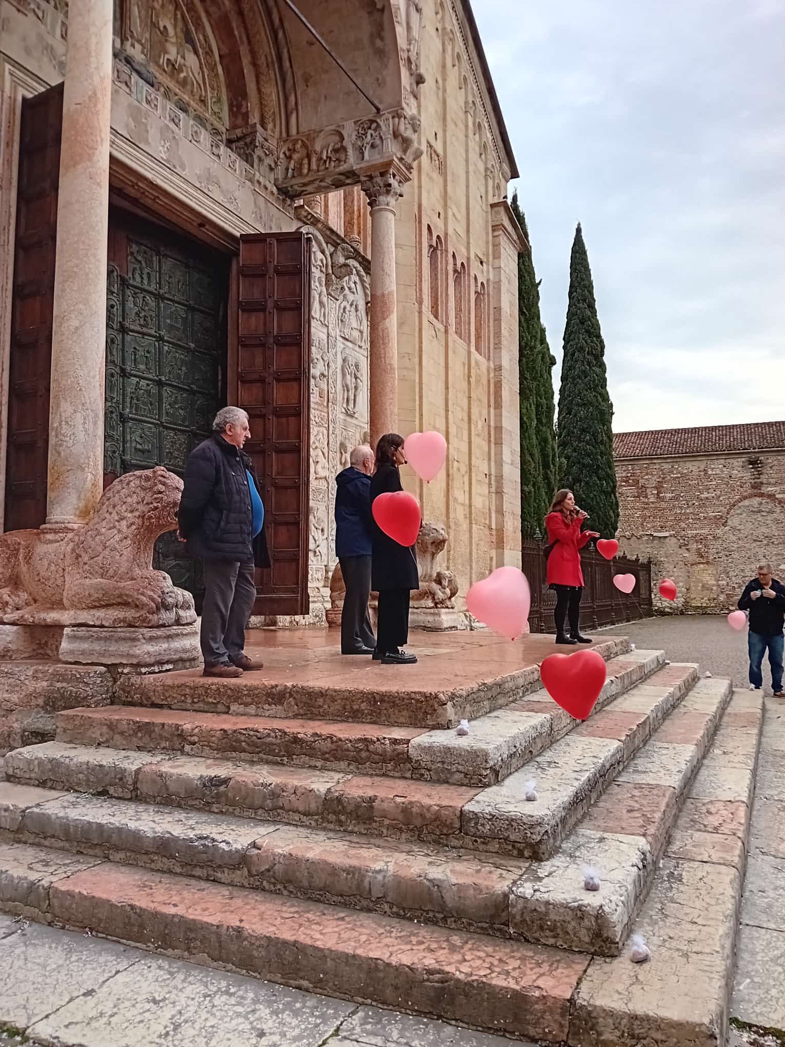 L’incontro è iniziato sul sagrato della Basilica, dove don Antonio Scattolini insieme a Martina, una storica dell’arte, hanno illustrato le celebri formelle del portale di San Zeno offrendo una lettura simbolica cristiana dei bassorilievi. A seguire, nella Basilica inferiore, i partecipanti hanno potuto contemplare la Pala del Mantegna, analizzata con sguardo teologico e artistico. Nel chiostro di San Zeno, i fidanzati hanno poi vissuto un percorso esperienziale articolato in tre tappe — fedeltà, indissolubilità e fecondità — che ha permesso loro di riflettere insieme sui fondamenti del matrimonio cristiano. Ogni momento del cammino è stato arricchito da interventi e momenti di condivisione tra le coppie.