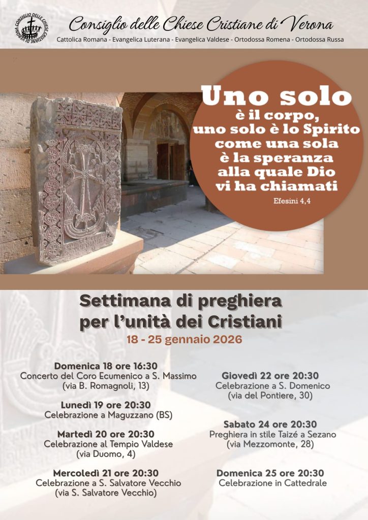 All’insegna della fratellanza, il Consiglio delle Chiese Cristiane di Verona – con i fedeli della chiesa Cattolica Romana, Evangelica Luterana e Valdese, Ortodossa Romena e Russa – propone il seguente programma: