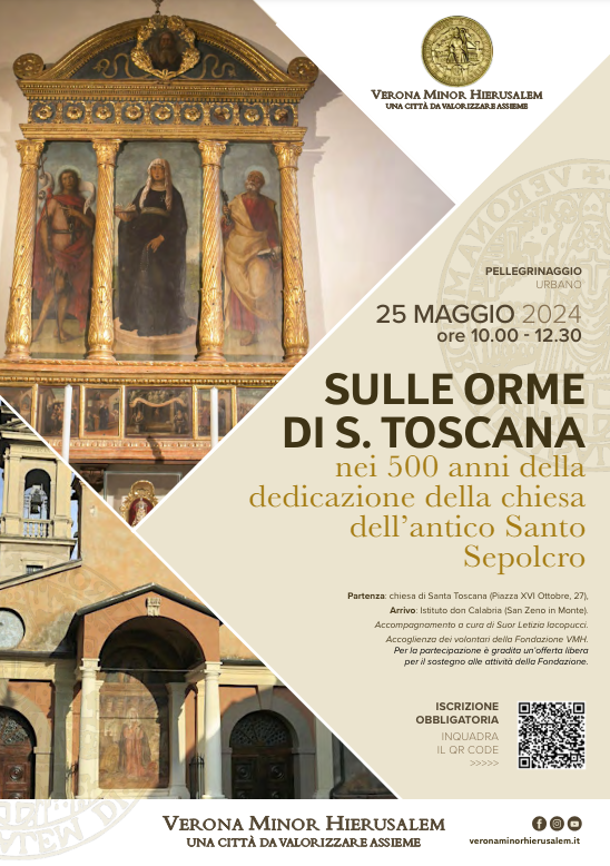 Sabato 25 maggio 2024, dalle ore 10:00 alle ore 12:30, Fondazione Verona Minor Hierusalem propone il pellegrinaggio urbano Sulle orme di Santa Toscana nei 500 anni della dedicazione della chiesa dell’antico Santo Sepolcro.