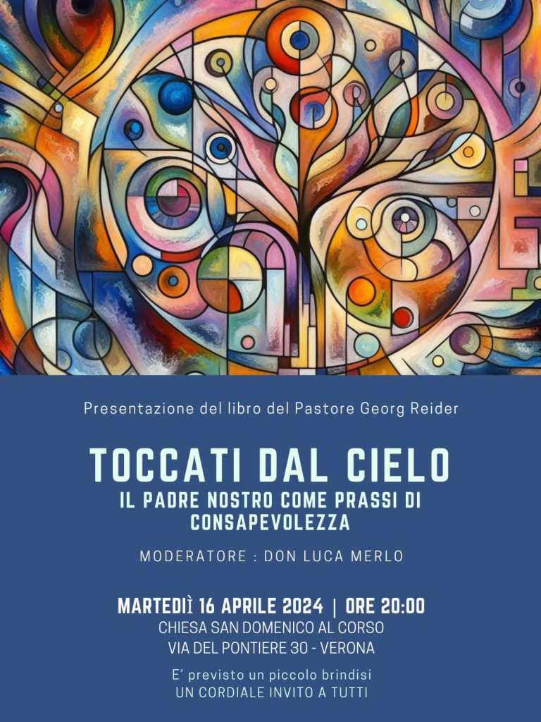 Toccati dal cielo, il Padre nostro come prassi di consapevolezza. È questo il titolo del nuovo volume di Georg Reider, pastore della Comunità evangelica luterana di Verona che sarà presentato martedì 16 aprile 2024 alle ore 20 nella chiesa di San Domenico al corso di via del Pontiere 30 a Verona.