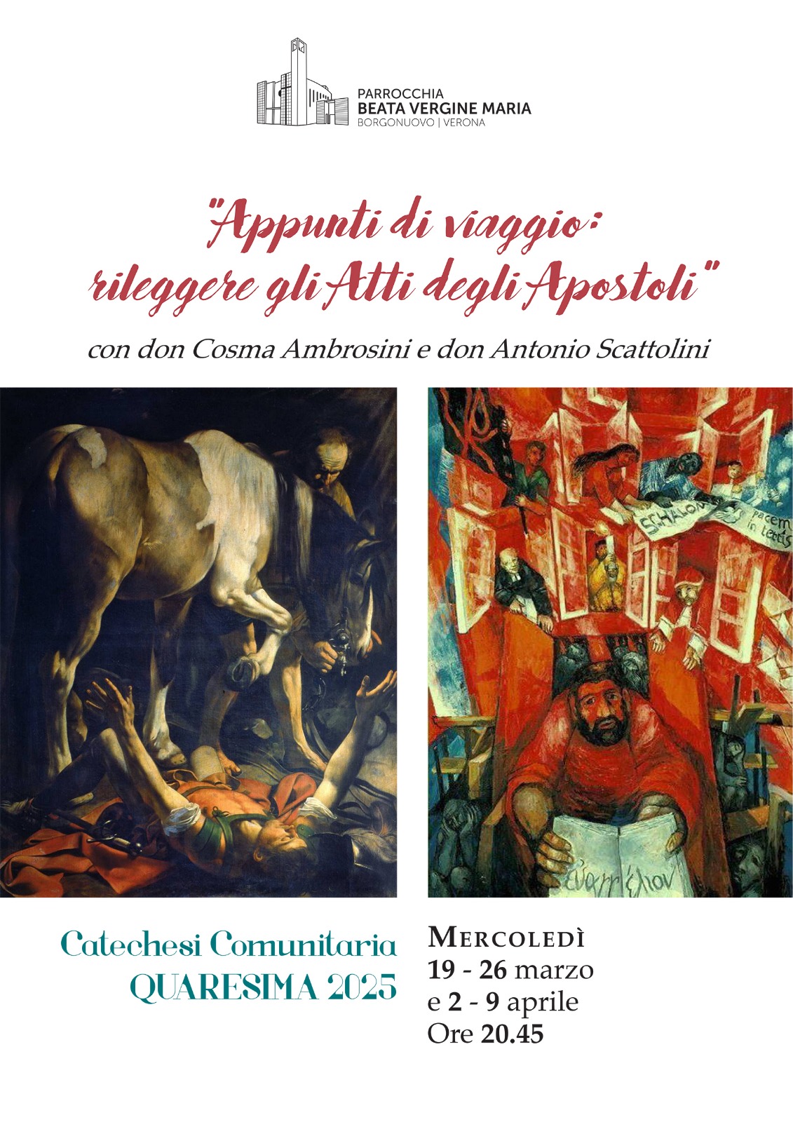 La Parrocchia Beata Vergine Maria di Borgonuovo propone per mercoledì 19 e 26 marzo, 2 e 9 aprile alle ore 20.45 gli incontri “Appunti di viaggio: rileggere gli Atti degli Apostoli“.