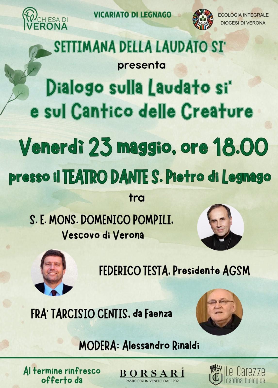Venerdì 23 maggio, alle 18.00, in occasione della Settimana della Laudato si’, si terrà una serata dedicata al dialogo sulla Laudato si’ e sul Cantico delle Creature tra S. E. Mons. Domenico Pompili, Fra’ Tarcisio Centis (da Faenza) e Federico Testa (Presidente AGSM) presso il Teatro Dante di San Pietro di Legnago. Al termine, un momento conviviale con rinfresco.