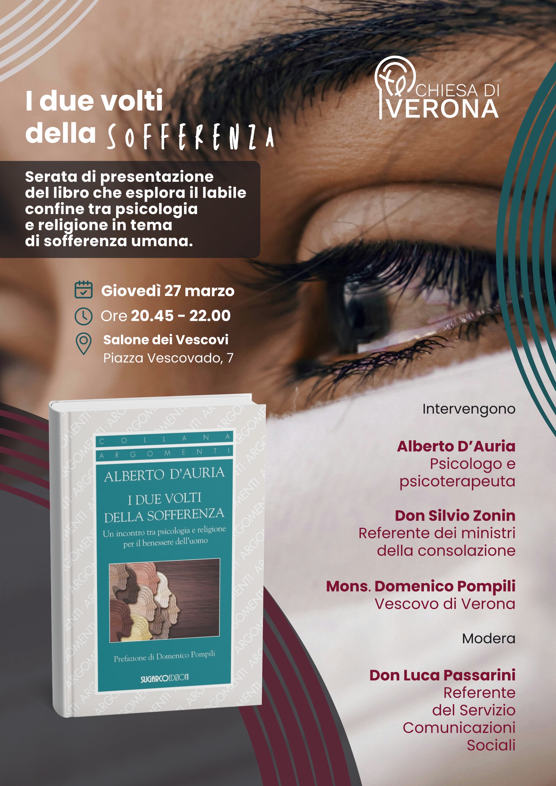 Giovedì 27 marzo 2025, alle ore 20.45, il Salone dei Vescovi ospiterà la presentazione del libro “I due volti della Sofferenza. Un incontro tra psicologia e religione per il benessere dell’uomo” di Alberto D’Auria.