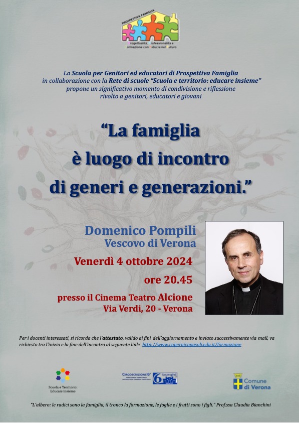 Il vescovo Domenico alla sera presso il cinema teatro Alcione interviene sul tema “La famiglia è luogo di incontro di generi e generazioni” che inaugura il percorso di formazione genitoriale di Prospettiva Famiglia (ore 20.45)