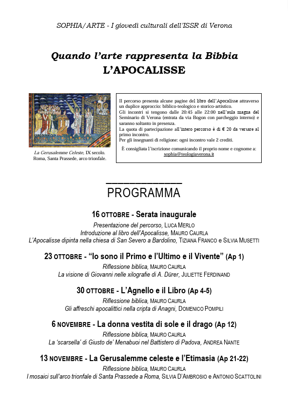 Giovedì 30 ottobre nell’aula magna del Seminario maggiore si tiene l’incontro di Sophia/Arte intitolato “L’Agnello e il libro”, nel contesto dei giovedì culturali dell’ISSR di Verona. Interviene il vescovo Domenico Pompili con l’approfondimento: “Gli affreschi apocalittici nella cripta di Anagni”(ore 20.45)