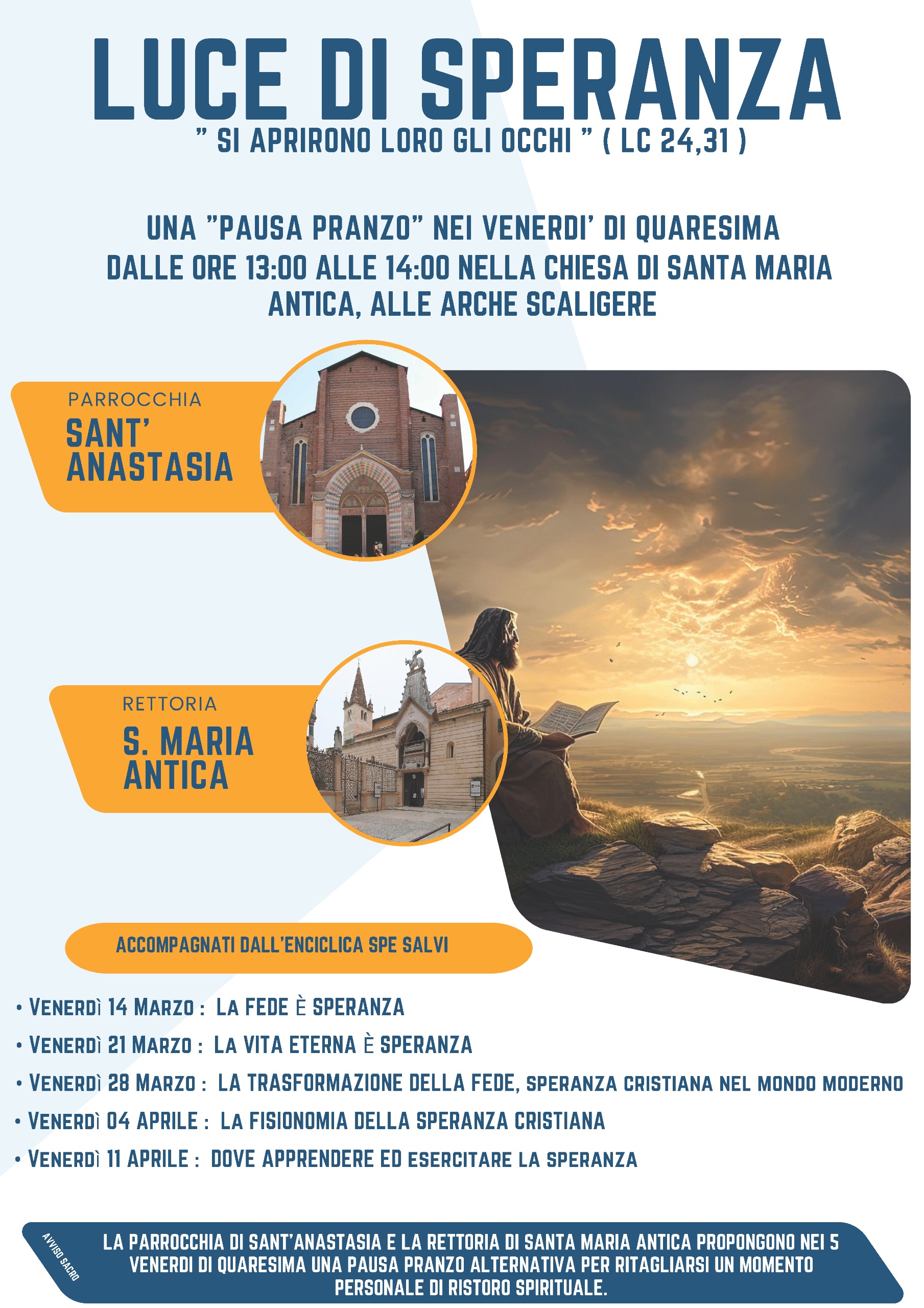 Tutti gli incontri saranno dalle ore 13.00 alle 14.00 nella Chiesa di Santa Maria Antica, alle Arche Scaligere.