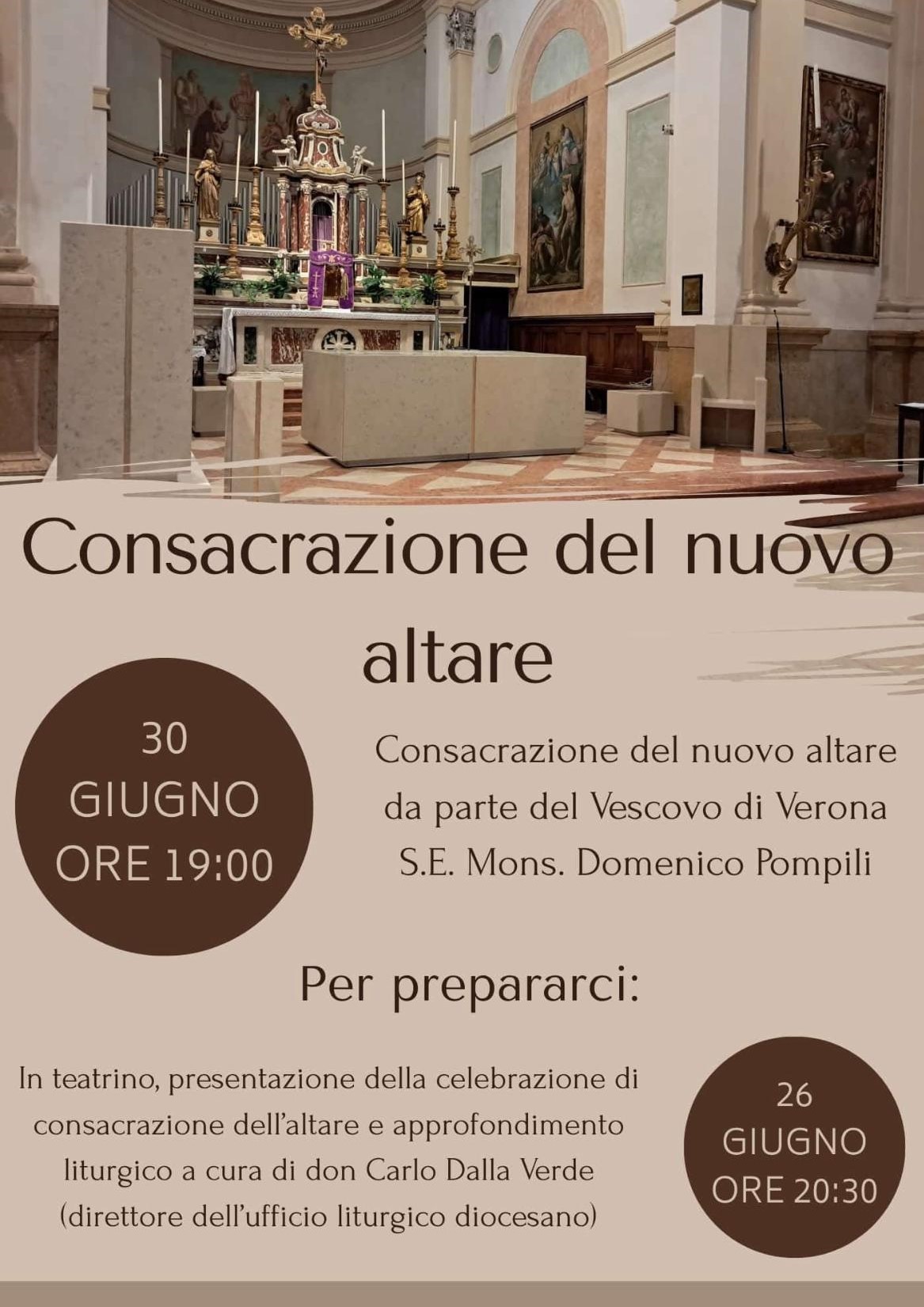 Lunedì 30 giugno nella chiesa di San Pietro Apostolo di Zevio sarà celebrata la Messa con il rito della dedicazione del nuovo altare, presieduta dal vescovo Domenico (ore 19.00). In preparazione, giovedì 26 giugno alle 20.30, Don Carlo Dalla Verde (referente del Servizio Liturgia diocesano) terrà, presso il teatro parrocchiale, un incontro di approfondimento sulla celebrazione della dedicazione dell’altare, aperto a tutti i fedeli.