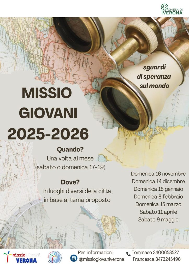 Un percorso per giovani dai 18 ai 35 anni che vogliono vivere una dimensione di missionarietà nella Diocesi di Verona, senza la prospettiva di un viaggio missionario. “Missio giovani – sguardi di speranza sul mondo” prevede un appuntamento al mese, da novembre a maggio, con incontri di scoperta, testimonianze, servizio e dialogo, anche interreligioso. È un viaggio a tappe, ma è possibile partecipare anche a singoli incontri, seguendo luoghi e temi di ciascun incontro sul profilo Instagram missiogiovaniverona.